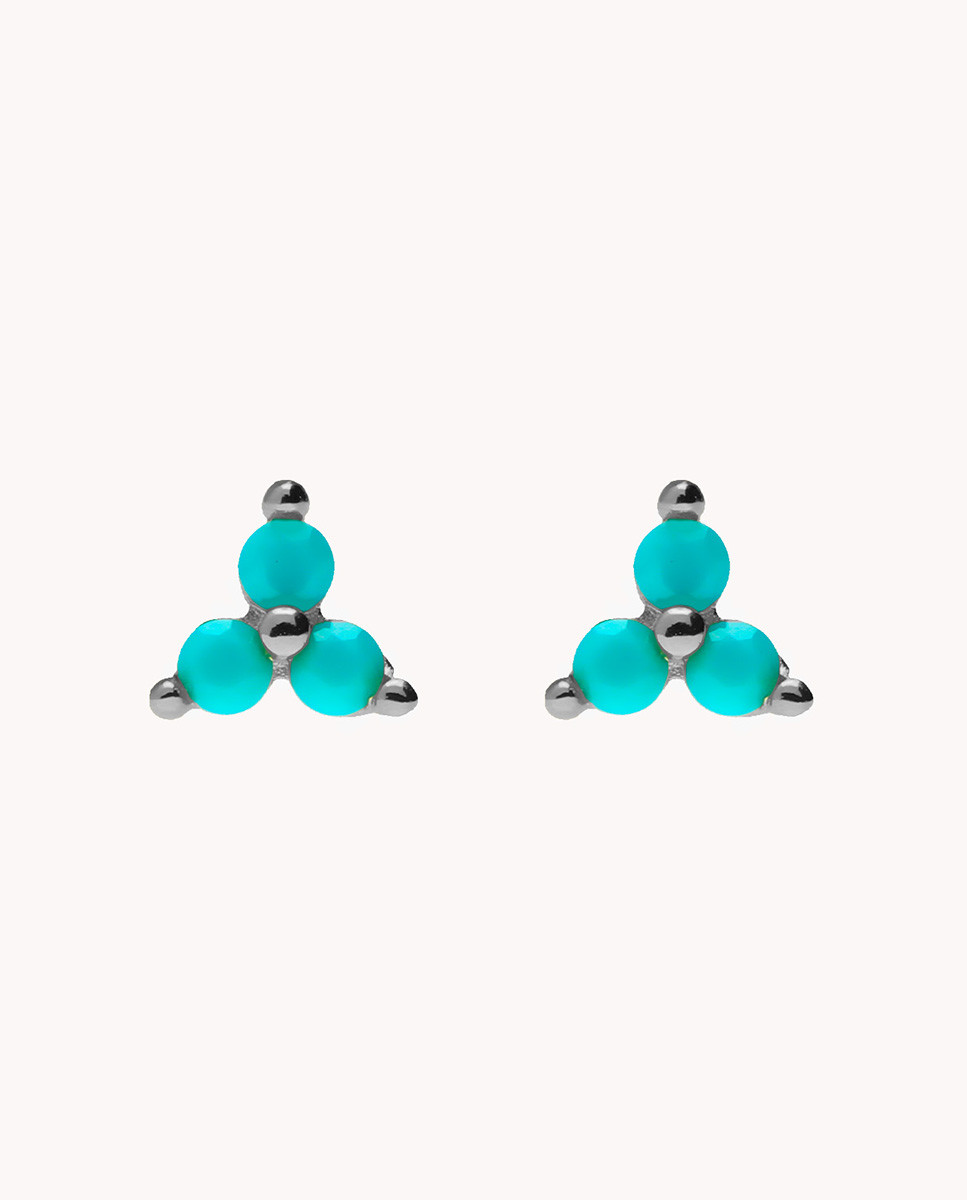 Pendientes de plata de ley 925 bañada en rodio con tres piedras turquesas de 2 mm y cierre de presión.
