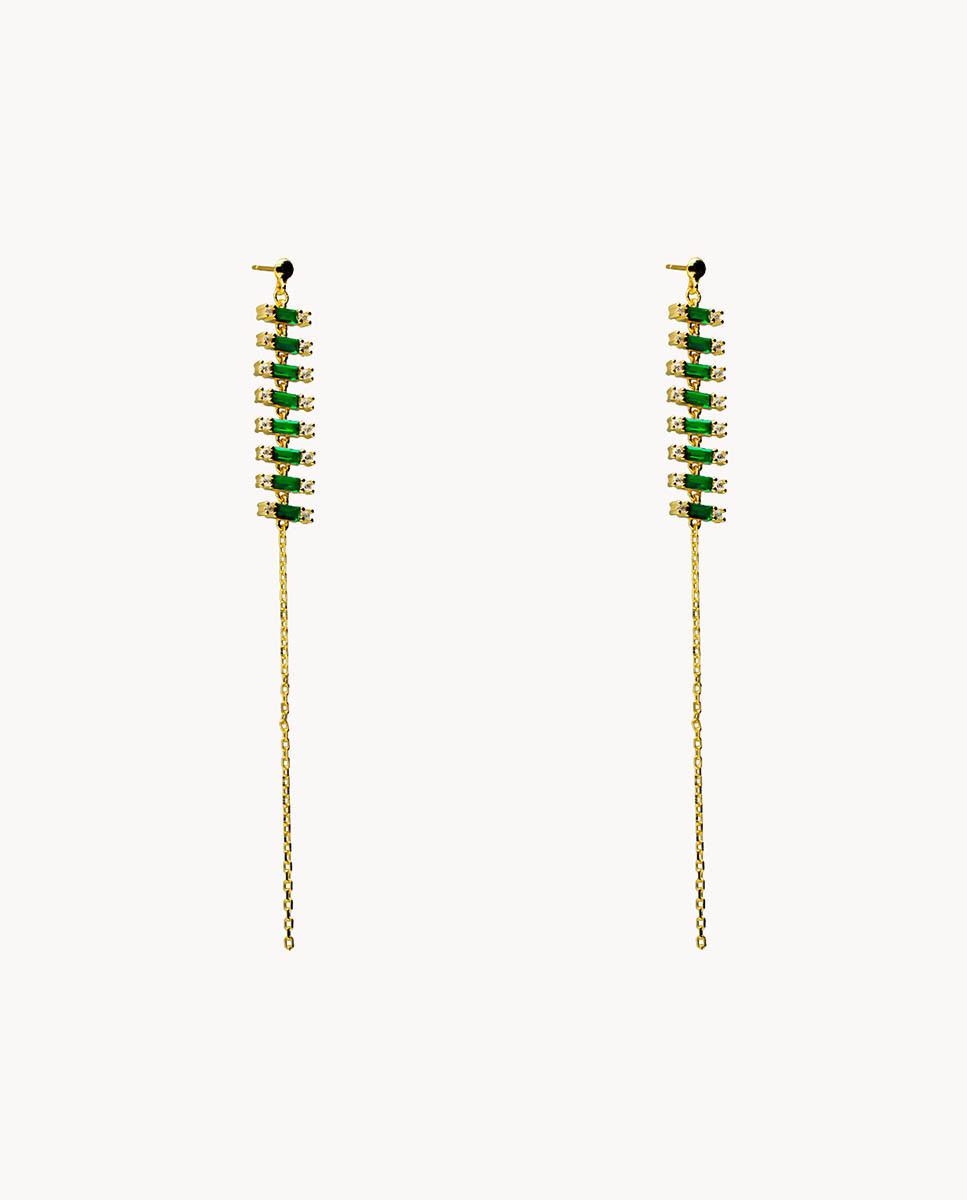 Pendientes de plata de ley 925 bañada en oro 18K con fila de circonitas color esmeralda talla baguette de 4 mm x 2 mm (ancho por alto) y circonitas blancas de 2 mm en ambos extremos, cadena de 6 cms de largo (largo total pendientes 9,5 cms) y cierre de presión.