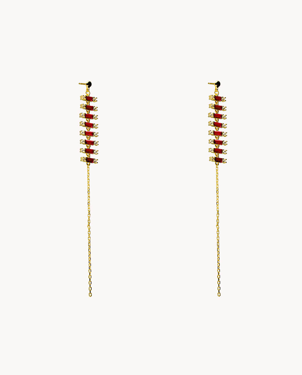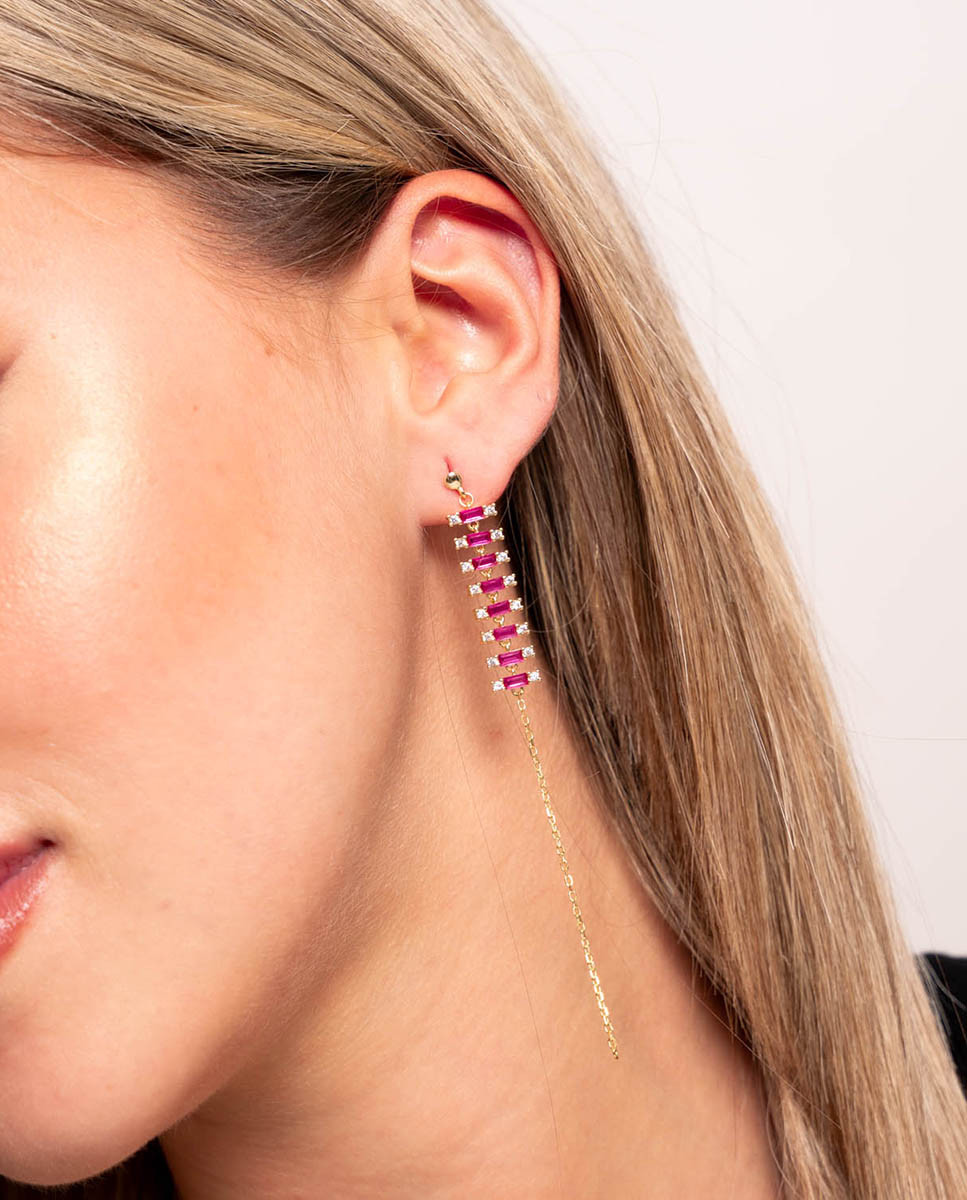 Pendientes de plata de ley 925 bañada en oro 18K con fila de circonitas color rubí talla baguette de 4 mm x 2 mm (ancho por alto) y circonitas blancas de 2 mm en ambos extremos, cadena de 6 cms de largo (largo total pendientes 9,5 cms) y cierre de presión.