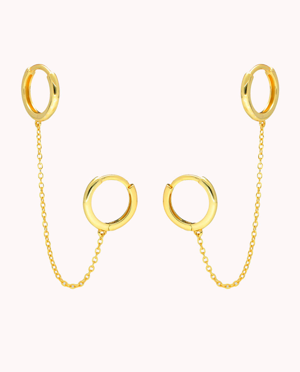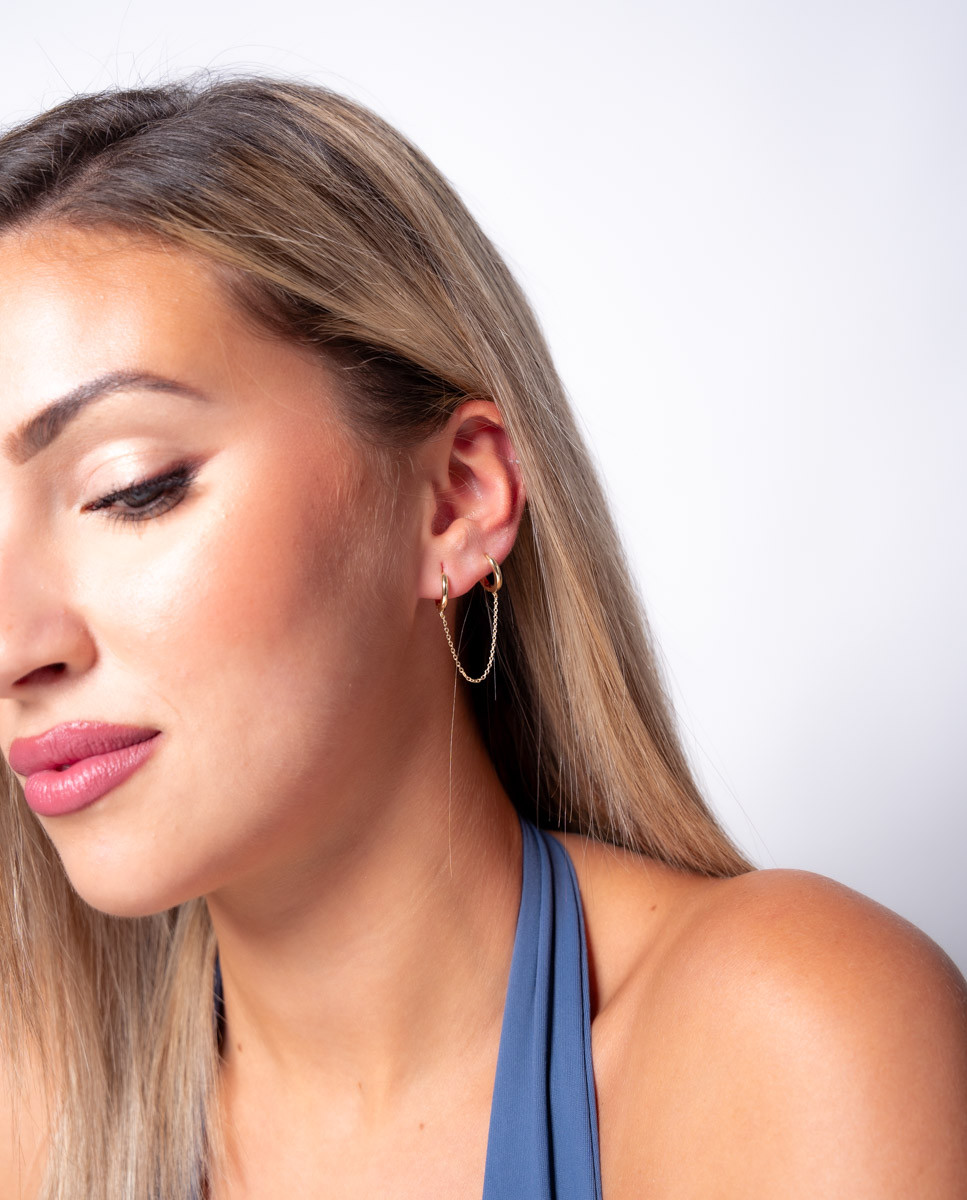 Pendientes de plata de ley 925 bañados en oro, compuesto por aro de 10 mm de diámetro y cadena larga de 5 cms de largo con ear cuff, cierre africano.