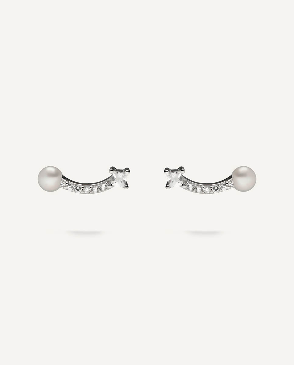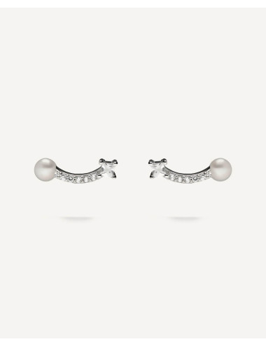 Pendientes de plata de ley 925 bañada en rodio con estrella y perla cultivada de 3 mm de diámetro, largo de 1 cm y cierre de presión.