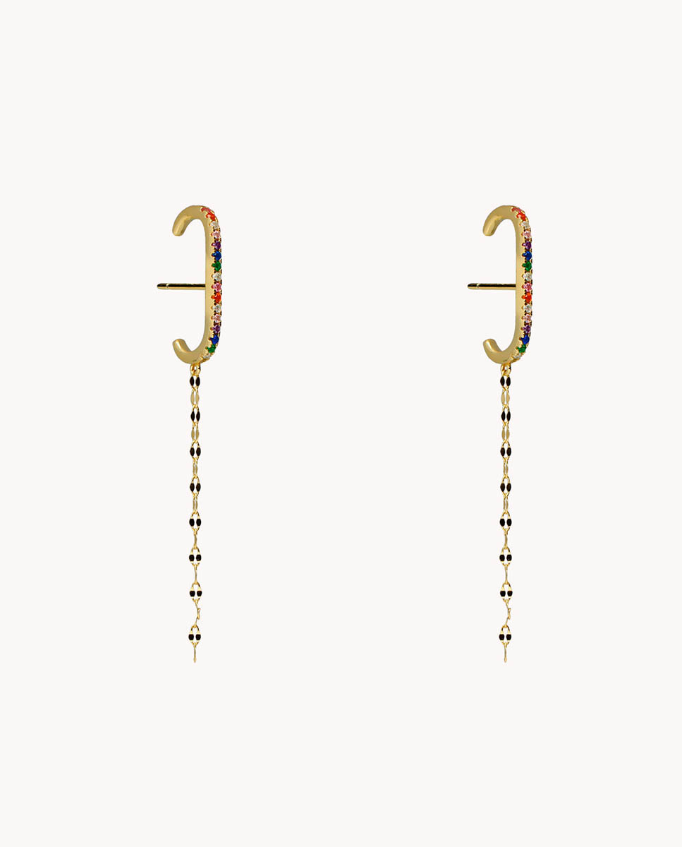 Pendientes de plata de ley 925 bañada en oro 18K con circonitas multicolor y cadena de 4 cms de largo, cierre de presión.