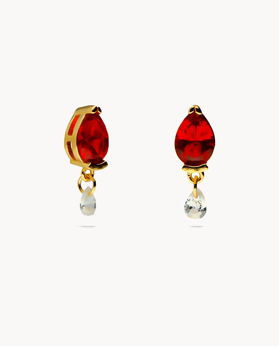 Pendientes de plata de ley 925 bañada en oro 18K con circonita roja de 4 mm x 8 mm (ancho por alto) y circonita blanca colgante en forma de gota de 3 mm x 4 mm (ancho por alto), cierre de presión.