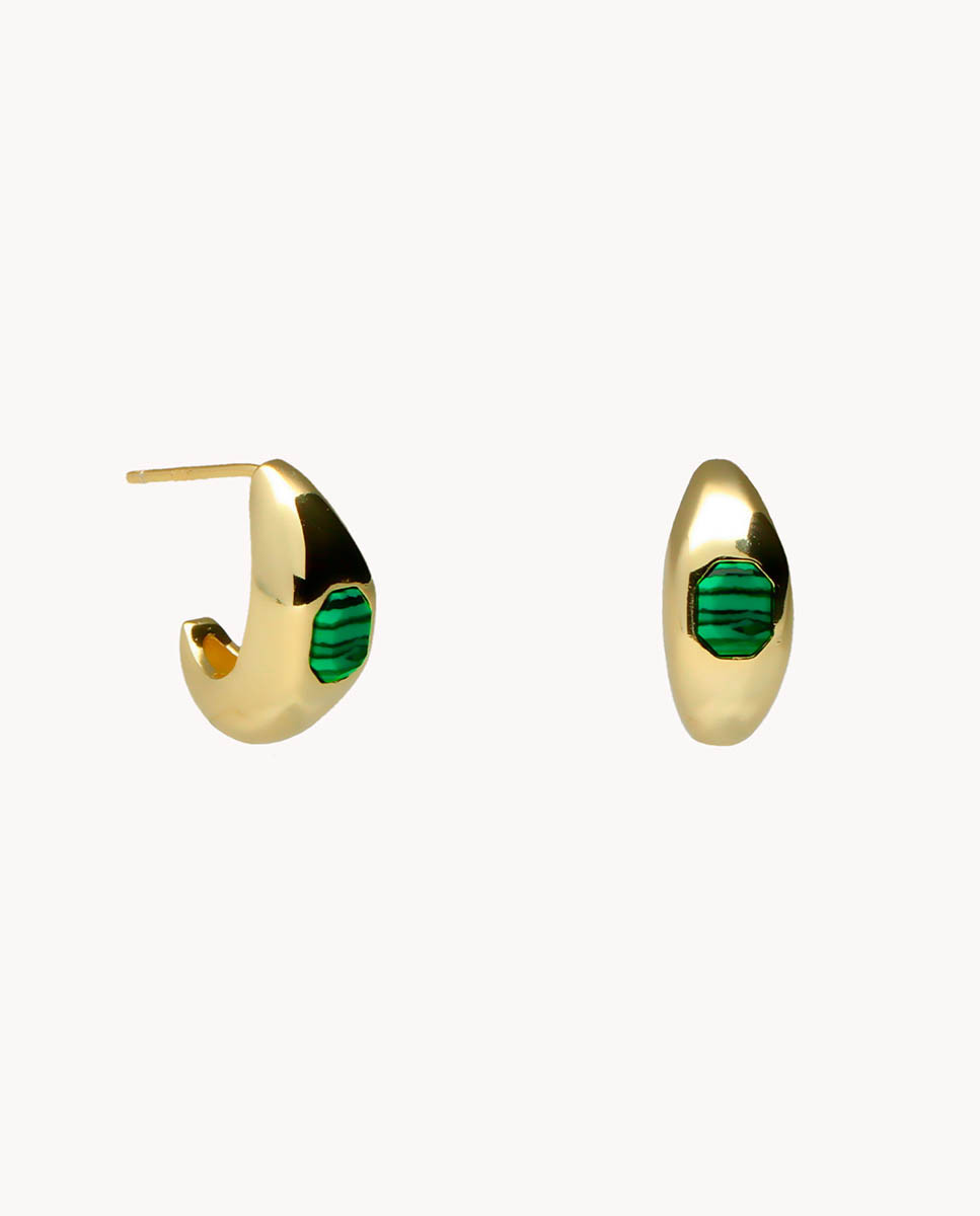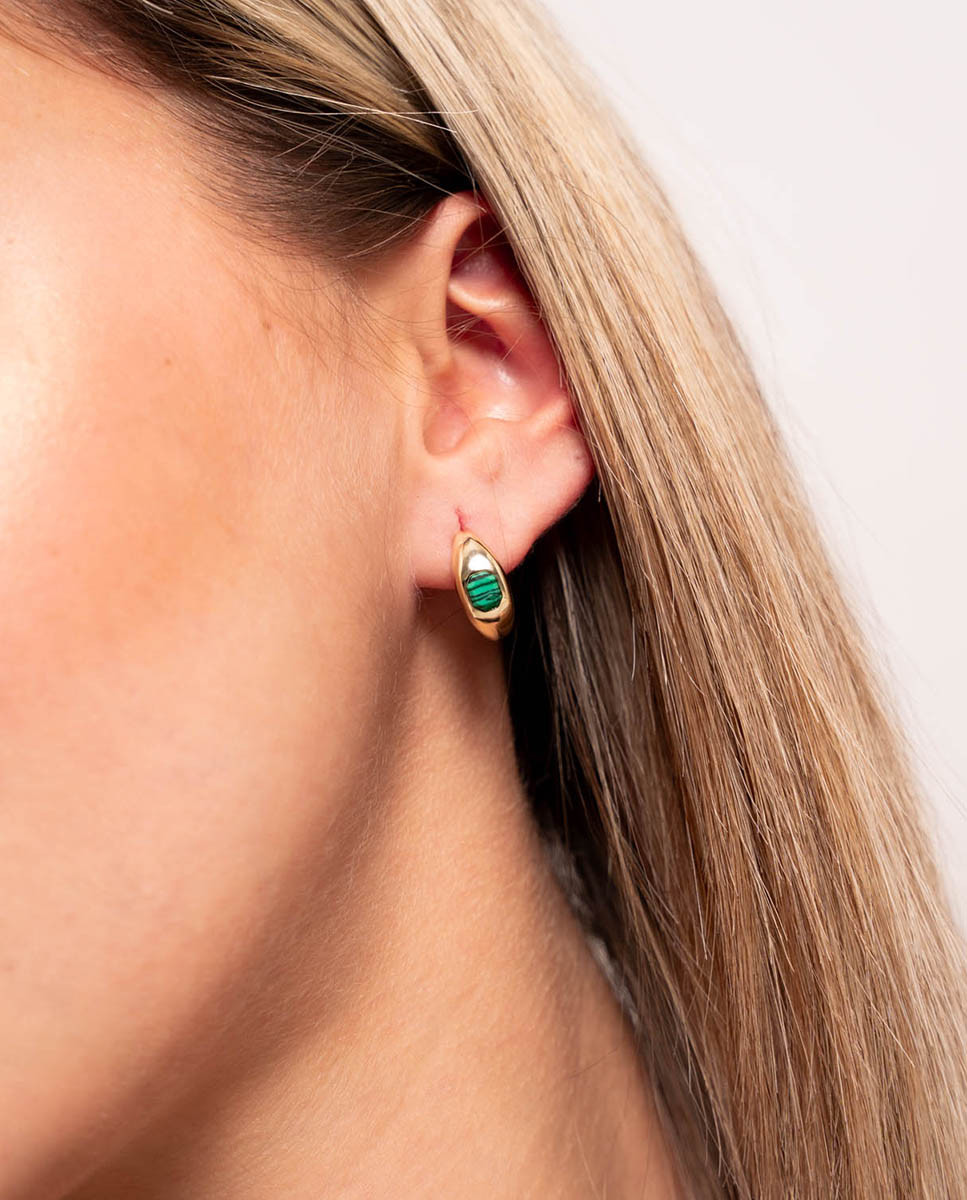 Pendientes medios aros de plata de ley 925 bañada en oro 18K de 15 mm de largo y 7 mm de ancho, piedra natural Malaquita en la zona central y cierre de presión.