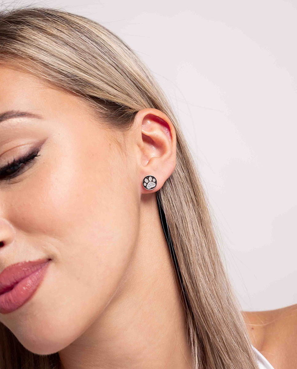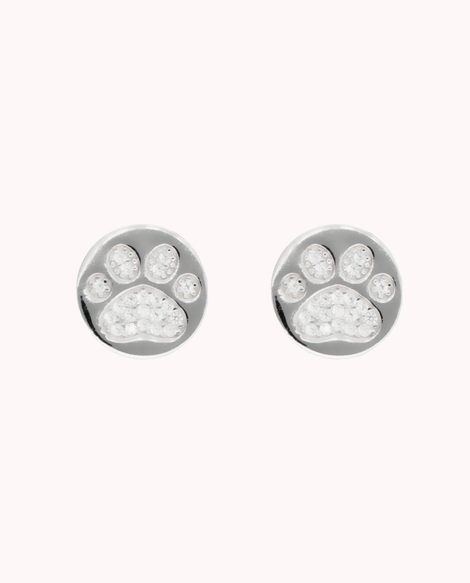 Pendientes de plata de ley 925 bañada en rodio con huella de perro e interior de circonitas blancas, 9 mm de diámetro y cierre de presión.