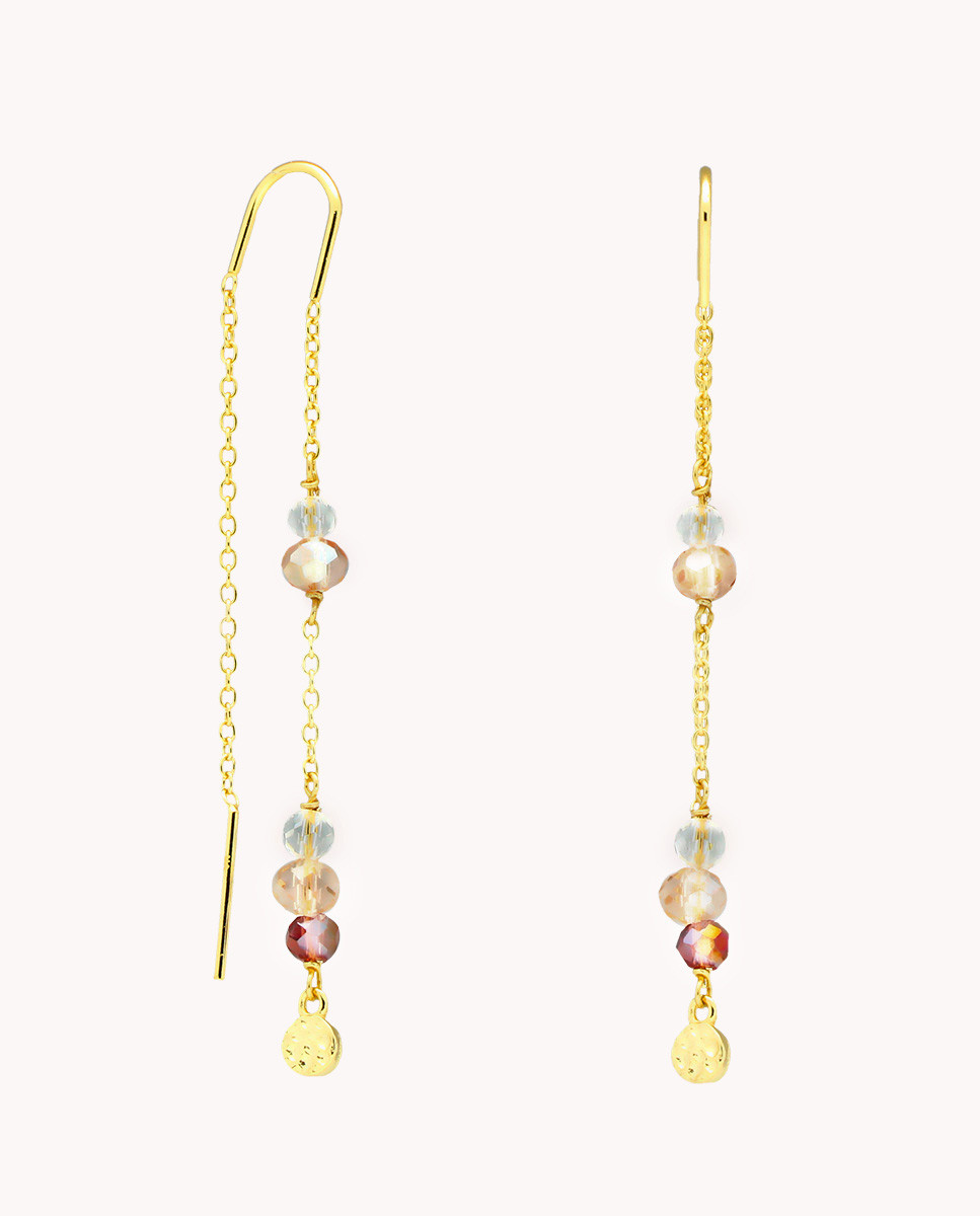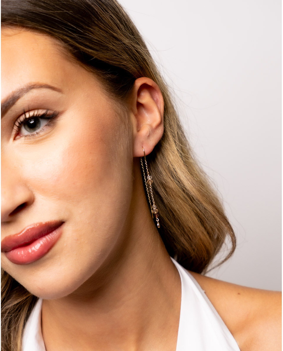 Pendientes de plata de ley 925 bañada en oro 18K con una cadena con combinación de piedras blancas y amatistas de 5 cms de largo aproximadamente y cierre de gancho con cadena de 4 cms. La tonalidad de las piedras puede variar.