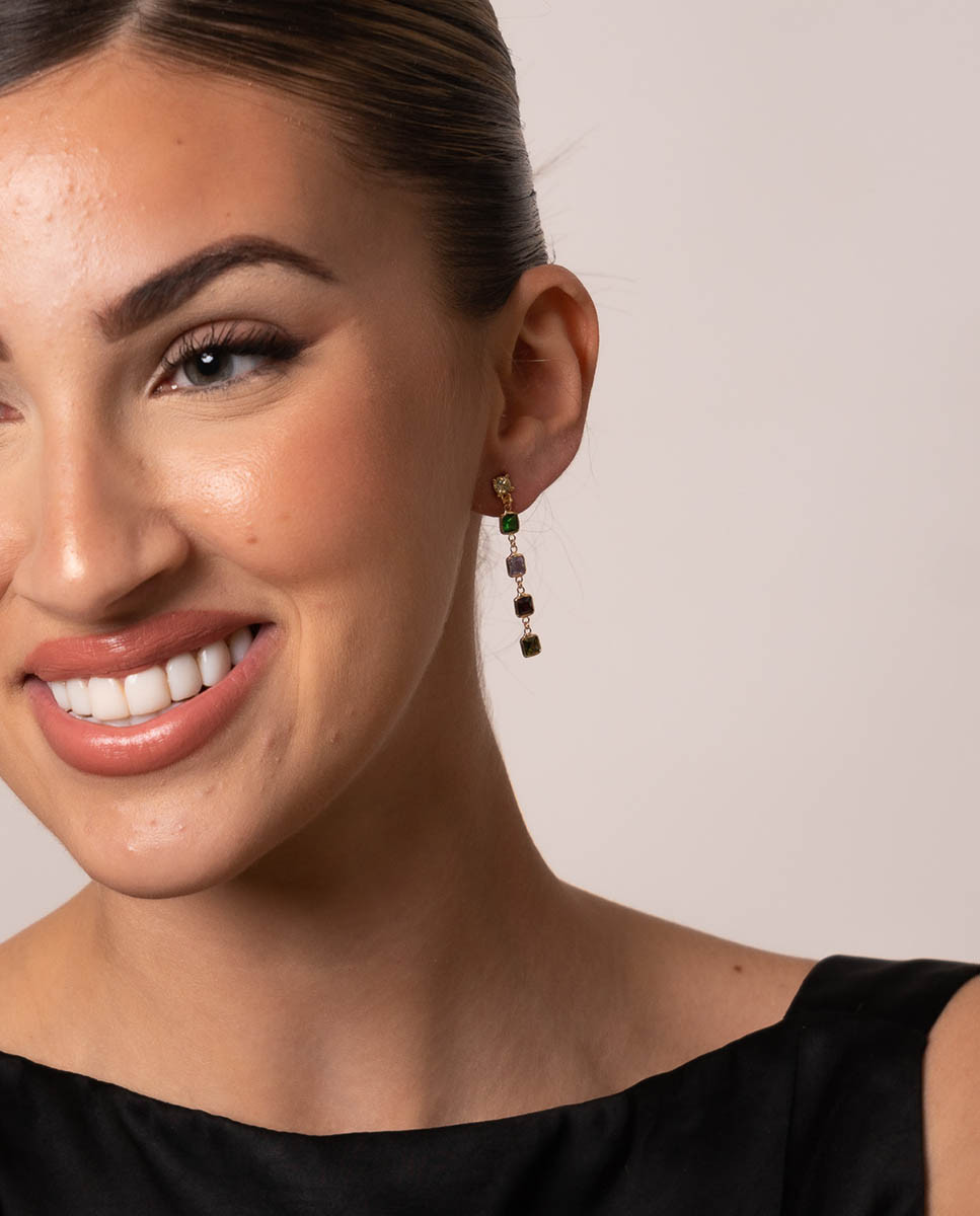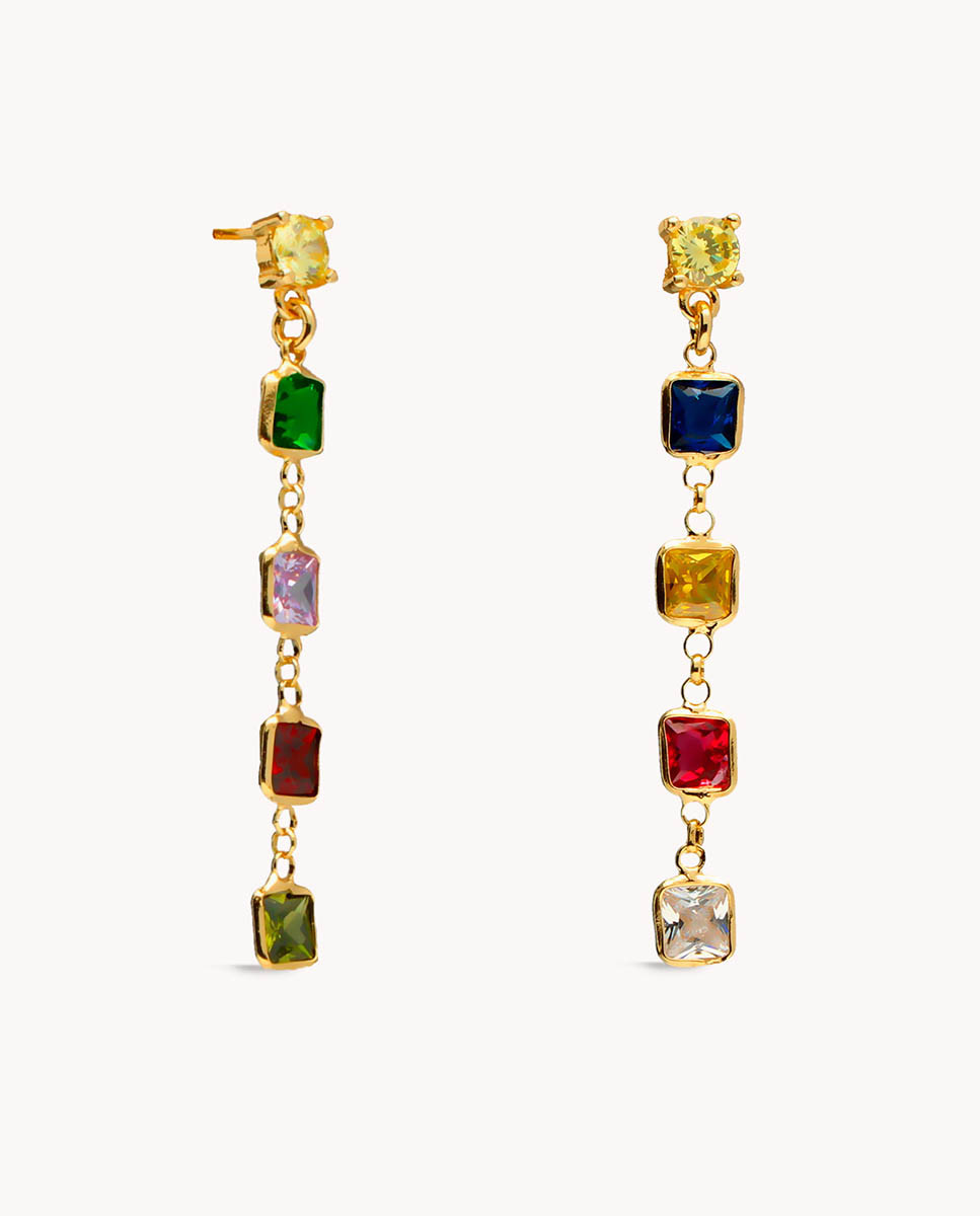 Pendientes de plata de ley 925 bañada en oro 18k con circonitas multicolor en cadena de 4 cms de largo y cierre de presión.