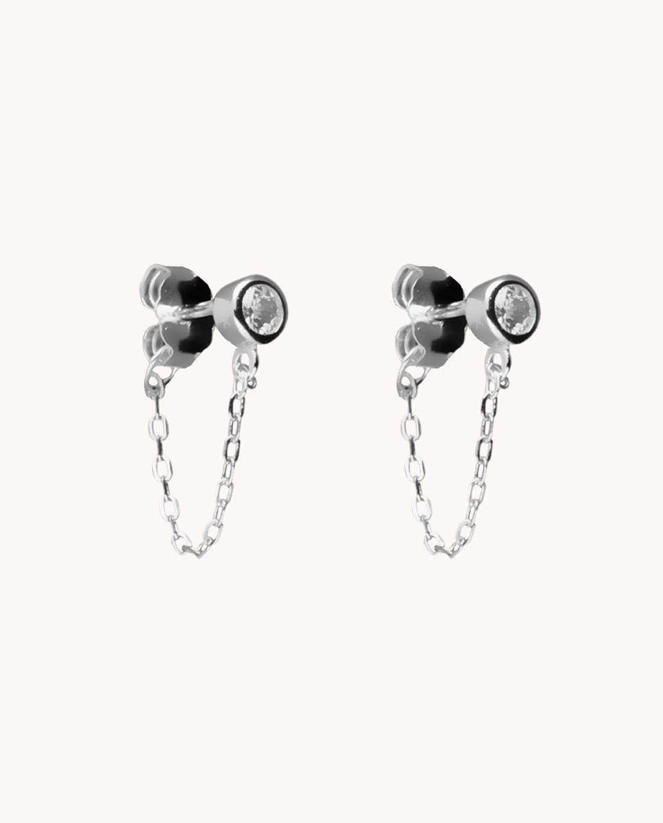 Pendientes de plata de ley 925 bañados en rodio con chatón de circonita blanca de 4 mm de diámetro y cadena de 1,5 cms de largo, cierre de presión.
