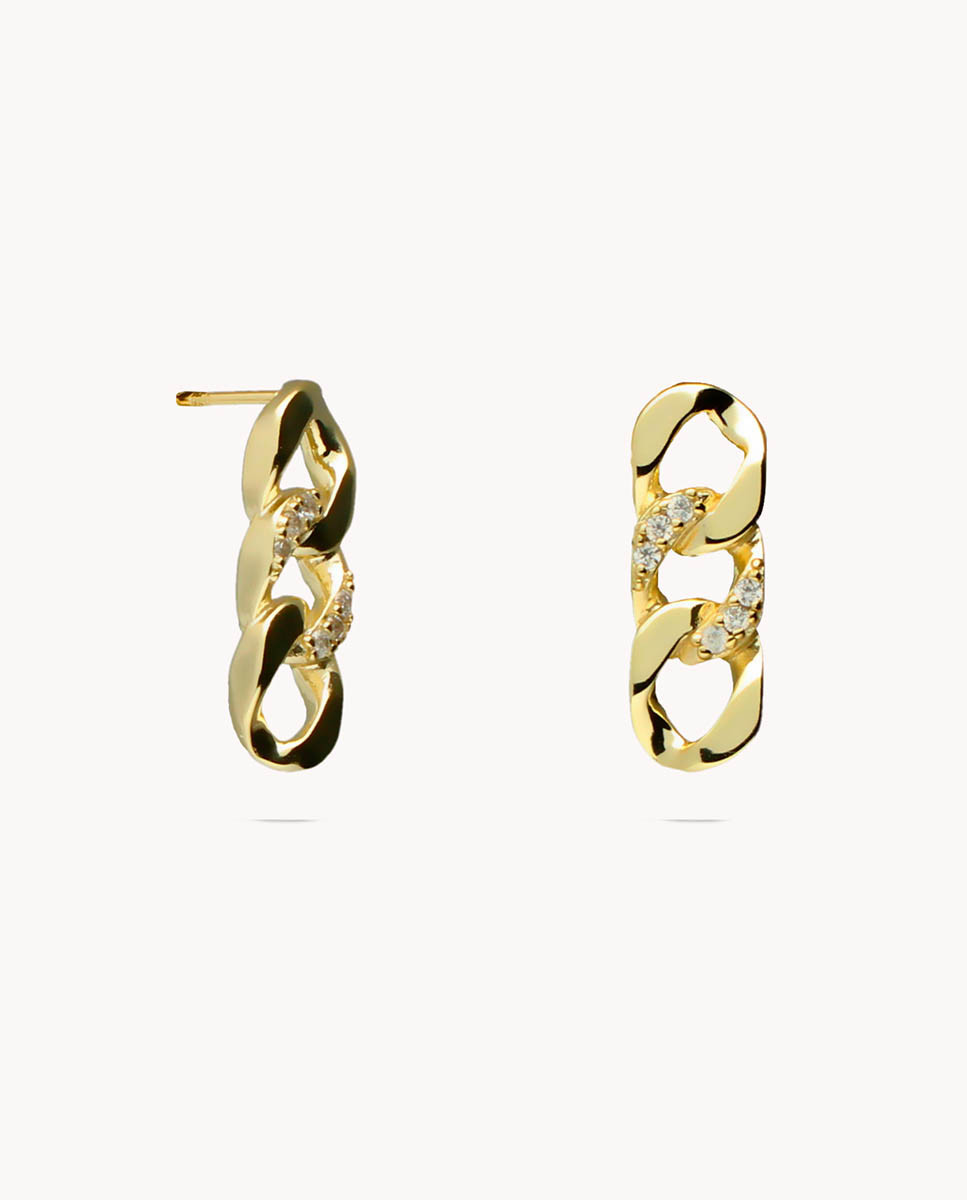 Pendientes de plata de ley 925 bañados en oro con eslabón barbado y circonitas blancas, 2 cms de largo y cierre de presión.