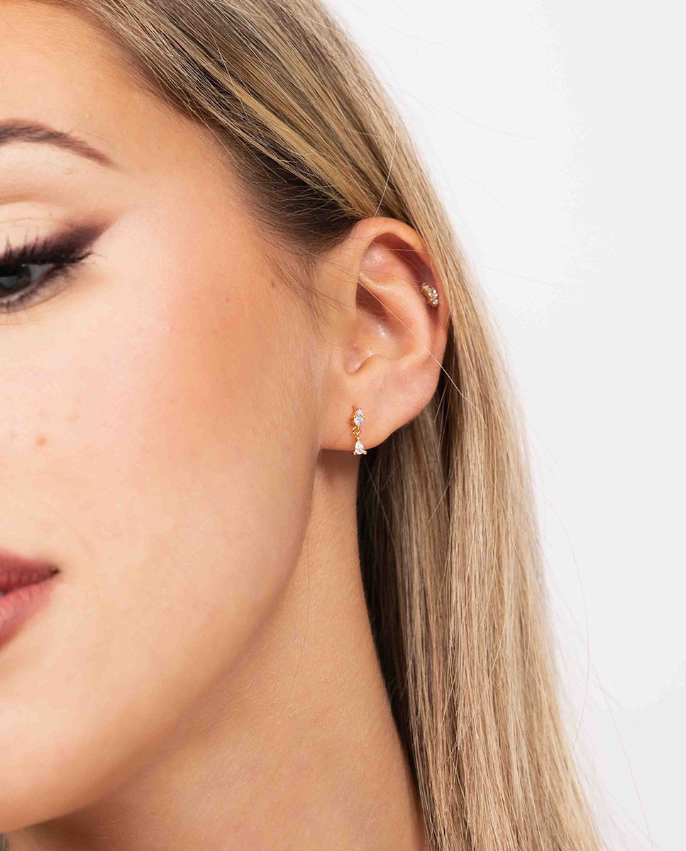 Pendientes de plata de ley 925 bañada en oro 18K con circonita blanca en forma de rombo de 2 mm x 4 mm (ancho por alto) y circonita blanca triangular con movimiento de 2 mm x 3 mm (ancho por alto), cierre de presión.