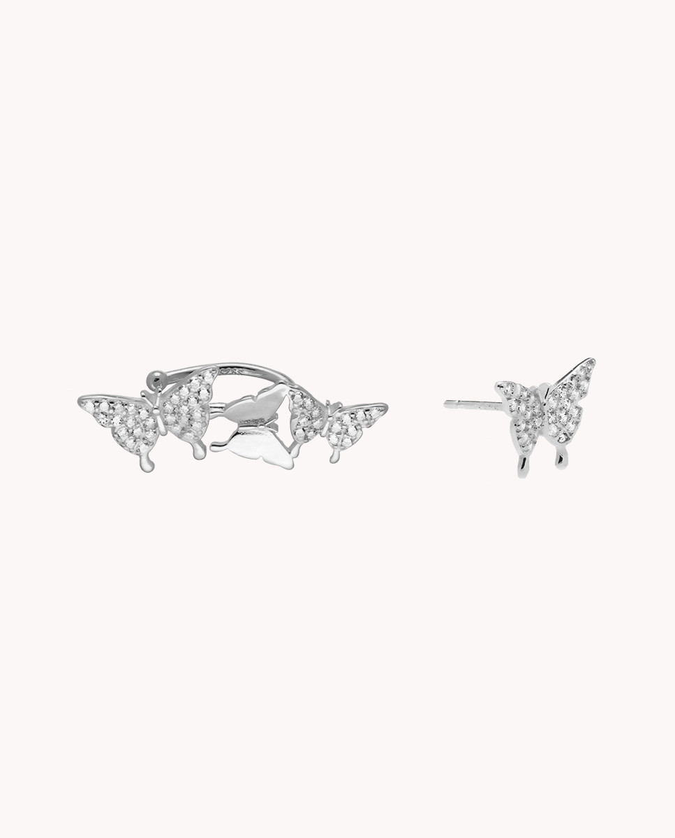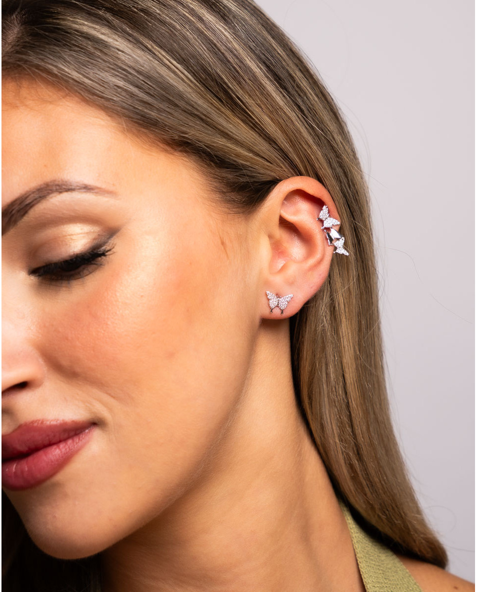 Pendientes de plata de ley 925 bañada en rodio, uno con mariposa de 10 mm con circonitas blancas y cierre de presión y el otro con mariposas combinadas de circonitas blancas de 2,0 cms y cierre ear cuff (izquierdo)