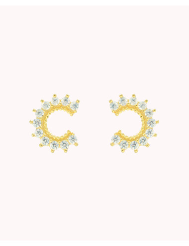 Pendientes de plata de ley 925 bañada en oro 18K con forma de media luna de 12 mm de alto y circonitas blancas, cierre de presión.