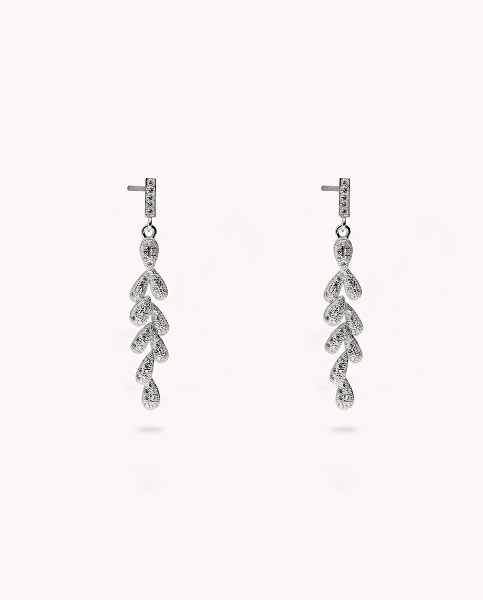Pendientes de plata de ley 925 bañados en rodio con forma de hojas y circonitas blancas, 4,5 cms de alto y cierre de presión.
