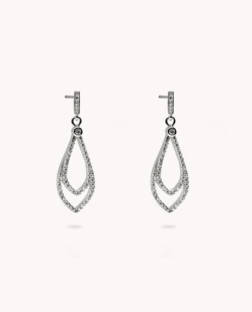 Pendientes de plata de ley 925 bañados en rodio con doble lágrima y circonitas blancas, 3,8 cms de alto y cierre de presión.