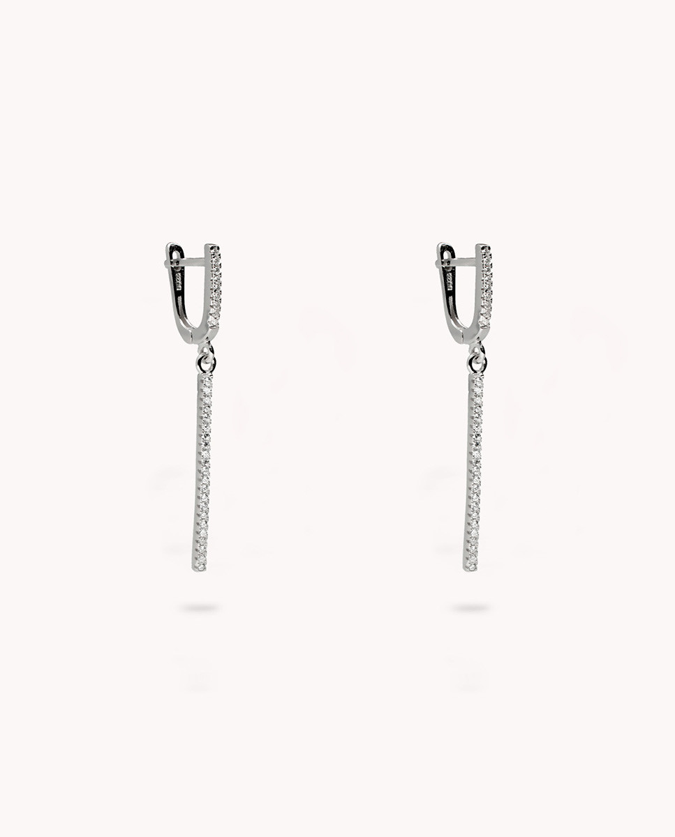 Pendientes de plata de ley 925 bañados en rodio con circonitas blancas verticales y 4,5 cms de alto, cierre catalán.
