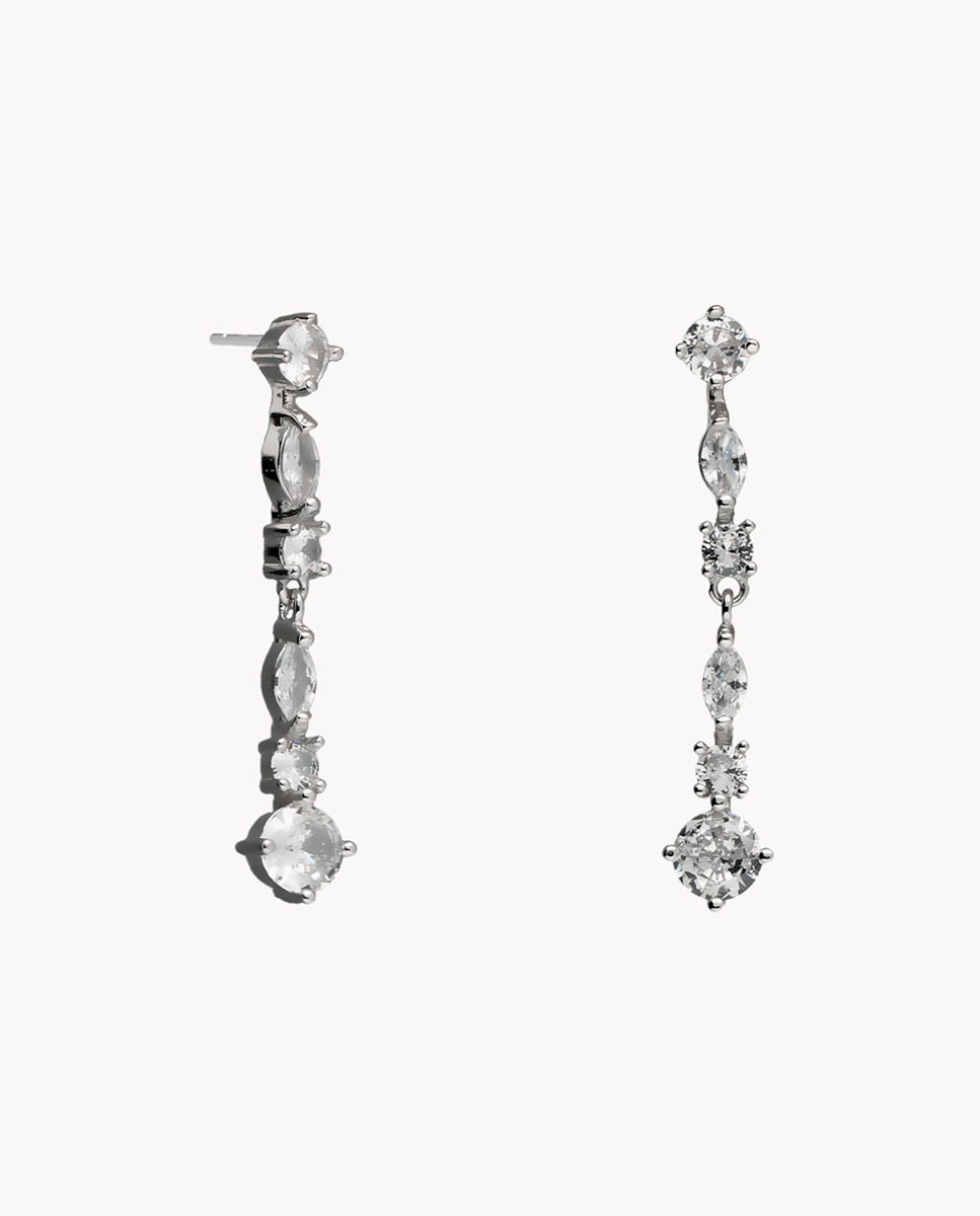 Pendientes de plata de ley 925 bañada en rodio con circonitas blancas en diferentes formas y 4 cms de alto, cierre de presión.