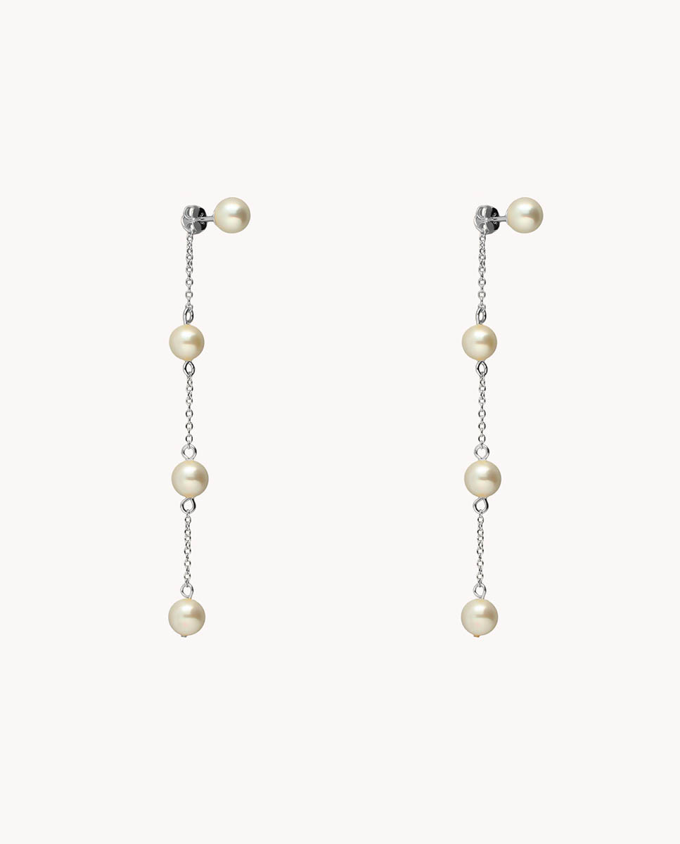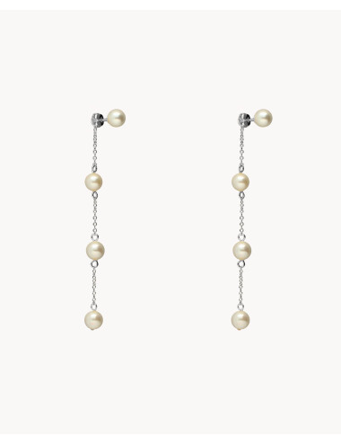 Pendientes de plata de ley 925 bañada en rodio con perla cultivada de 6 mm de diámetro y cadena incorporada en el cierre con perlas cultivadas de 6 mm de diámetro intercaladas, largo de 7 cms y cierre de presión.
