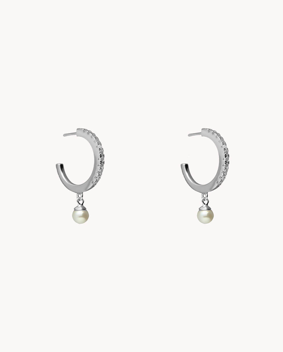 Pendientes de aro de plata de ley 925 bañada en rodio de 10 mm de diámetro interior y 2 mm de grosor con circonitas blancas y perla cultivada de 4 mm de diámetro, cierre de presión.