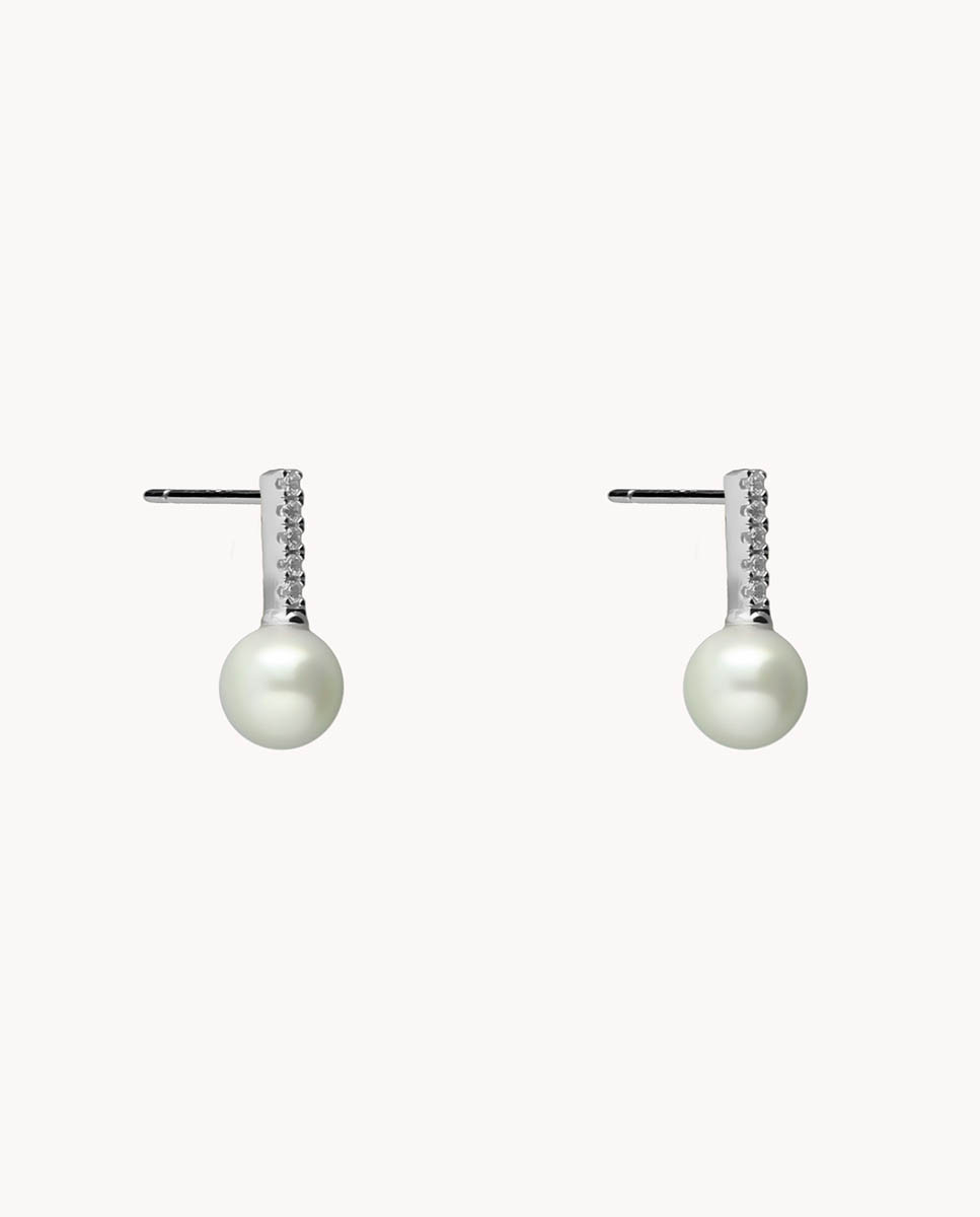 Pendientes de plata de ley 925 bañada en rodio con barra de circonitas blancas de 10 mm de largo finalizada en perla cultivada de 8 mm de diámetro y cierre de presión.