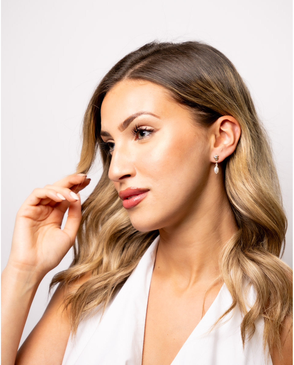 Pendientes de plata de ley 925 bañada en oro con piedra blanca y perla cultivada de 6 mm ( aproximadamente) 25 mm de largo y cierre de presión.