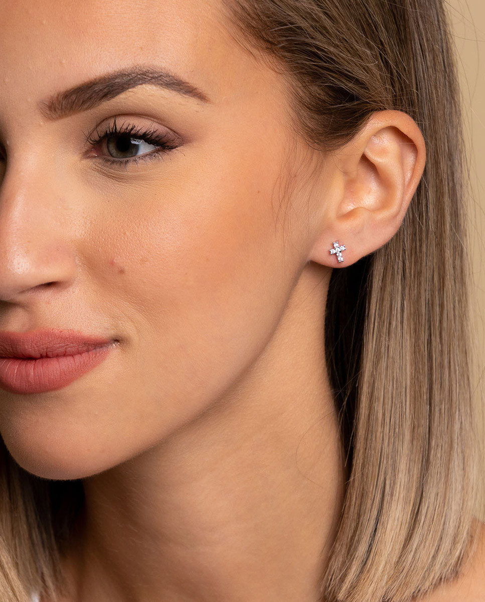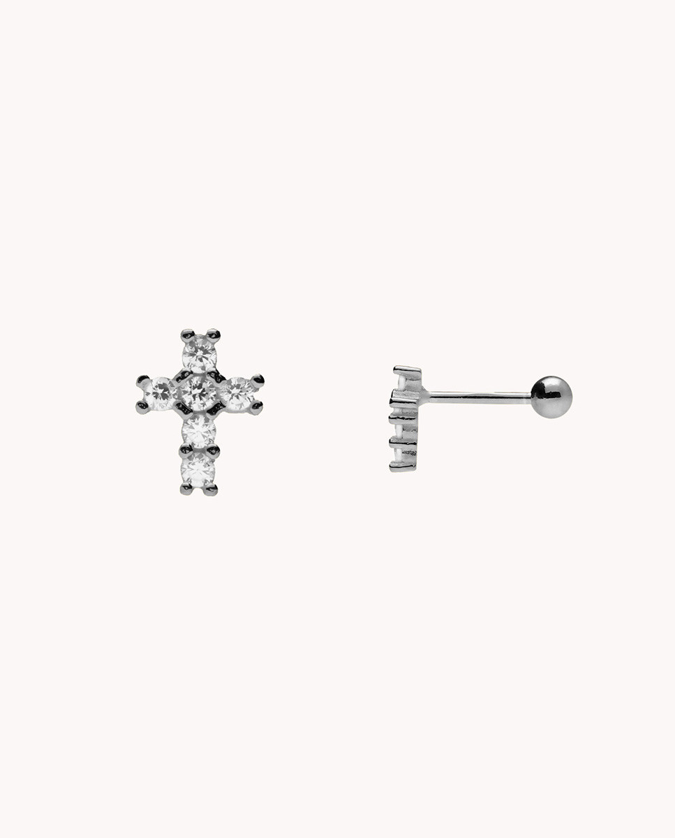 Pendientes de plata de ley 925 bañada en rodio con cruz y circonitas blancas, largo de palo 1 cm y cierre de rosca.