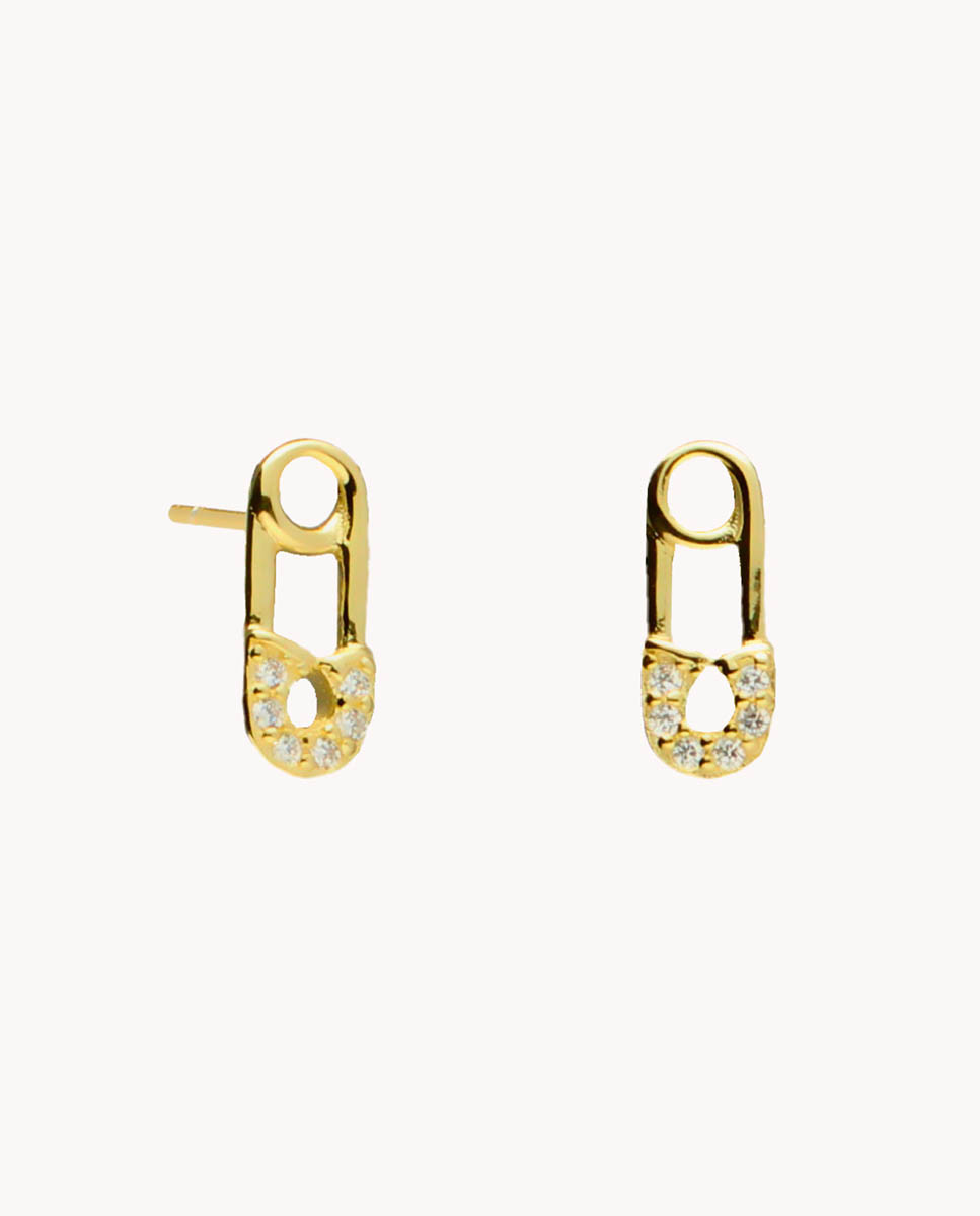 Pendientes pin de plata de ley 925 bañados en oro con forma de imperdible y circonitas