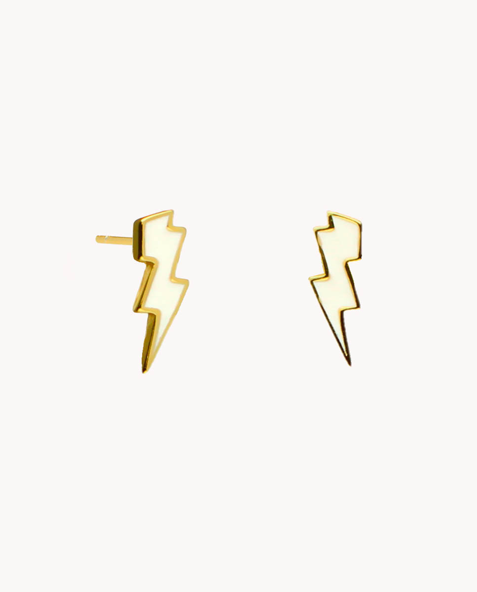 Pendientes de plata de ley 925 bañados en oro con forma de rayo de 10 mm esmaltados en blanco, cierre de presión.