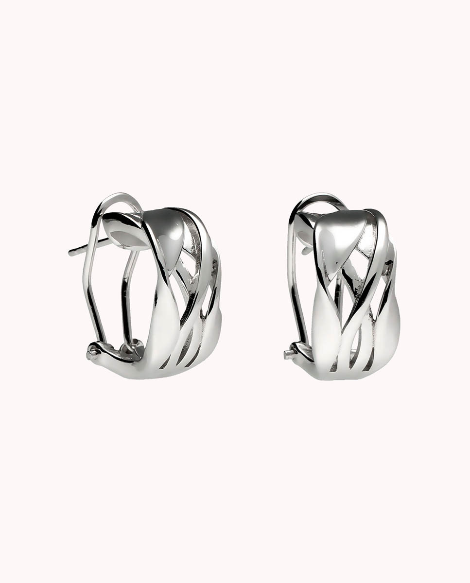 Pendientes de plata de ley 925 bañada en rodio con diseño cruzado y cierre tipo omega.