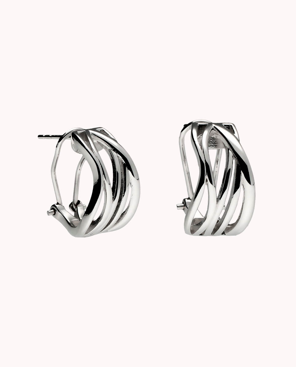 Pendientes de plata de ley 925 bañada en rodio con diseño cruzado y cierre tipo omega.