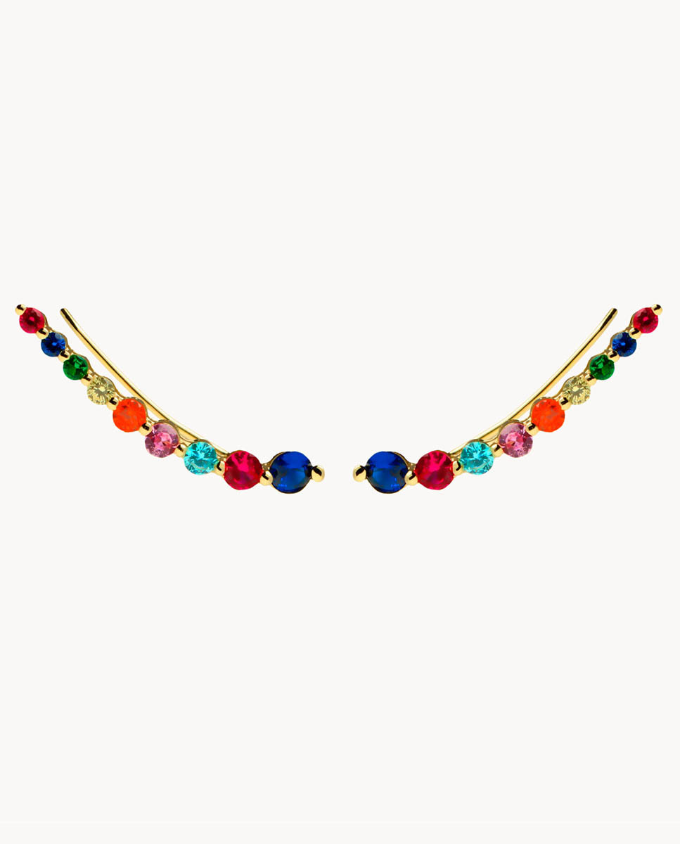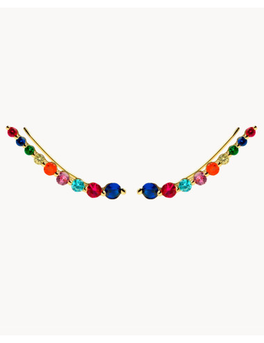 Pendientes trepadores de plata de ley 925 bañada en oro con circonitas multicolor en disminución, cierre de gancho y 3 cms de largo.
