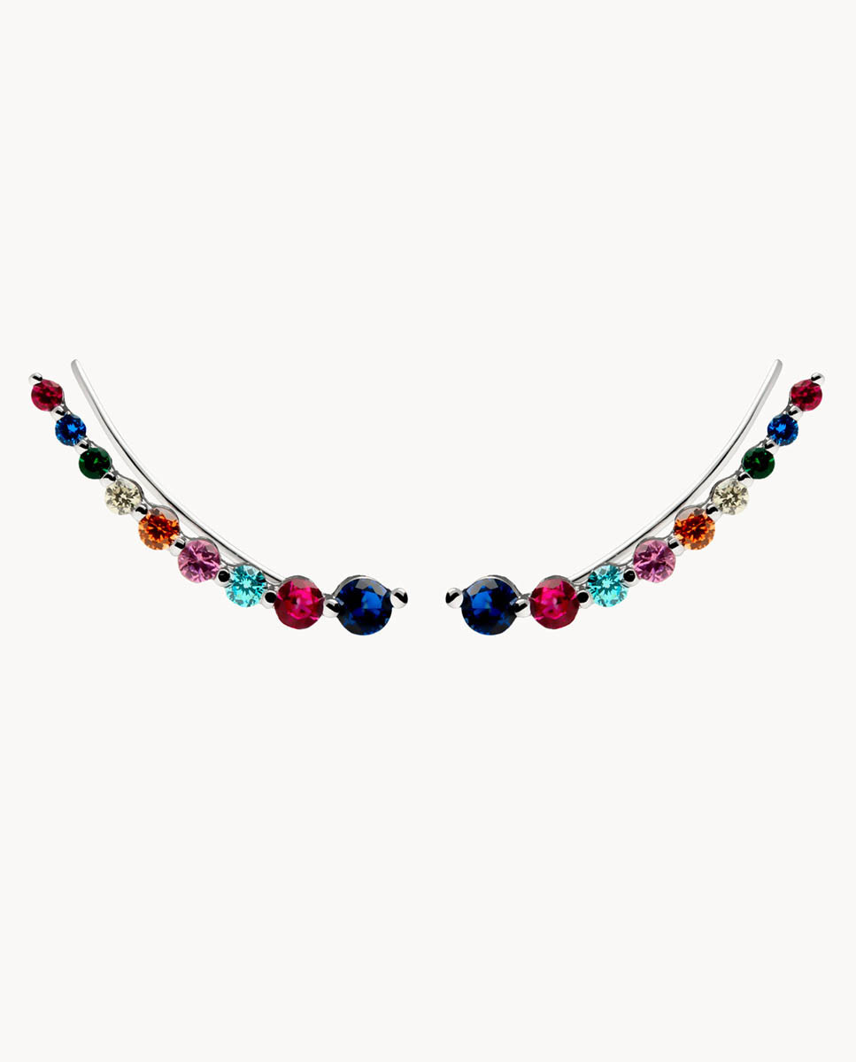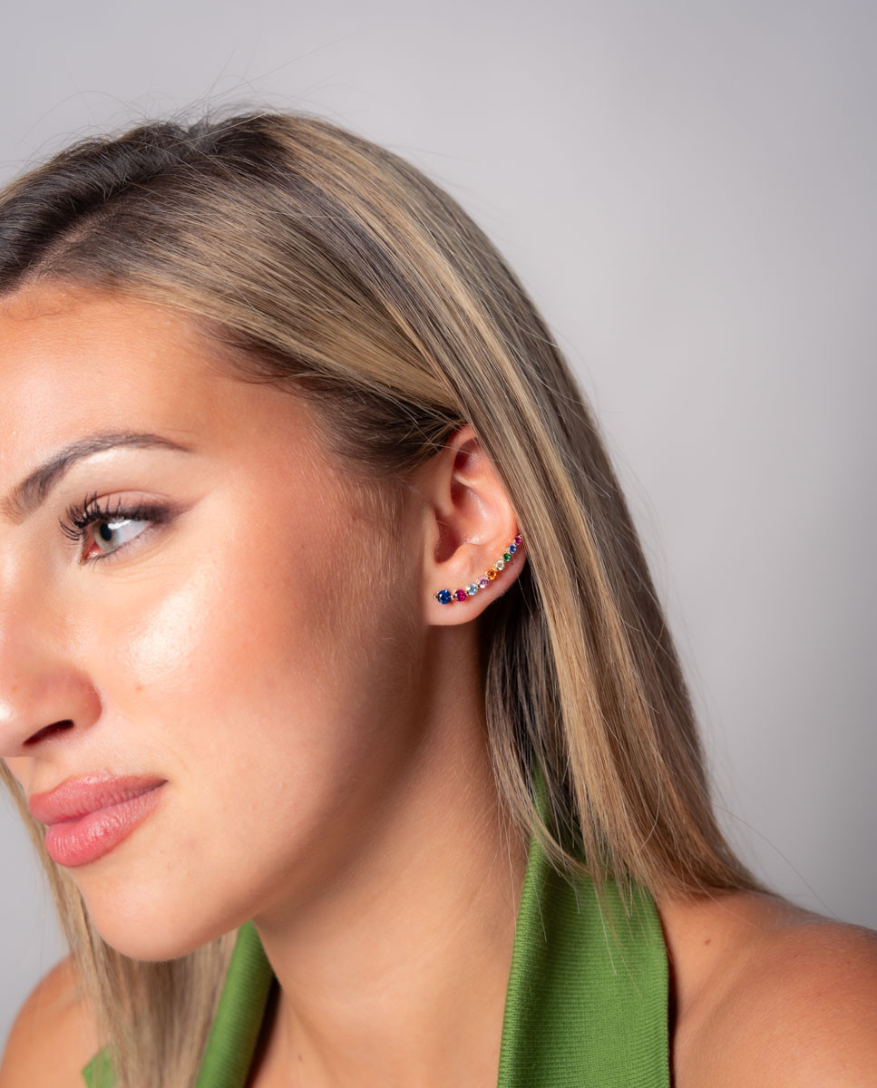 Pendientes trepadores de plata de ley 925 bañada en rodio con circonitas multicolor en disminución, cierre de gancho y 3 cms de largo.