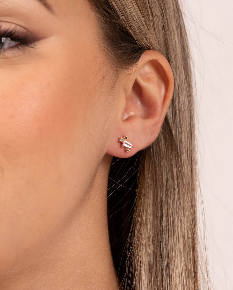Pendientes de plata de ley 925 bañada en oro 18K con circonita blanca en talla baguette y circonitas de color en las puntas, cierre de presión.