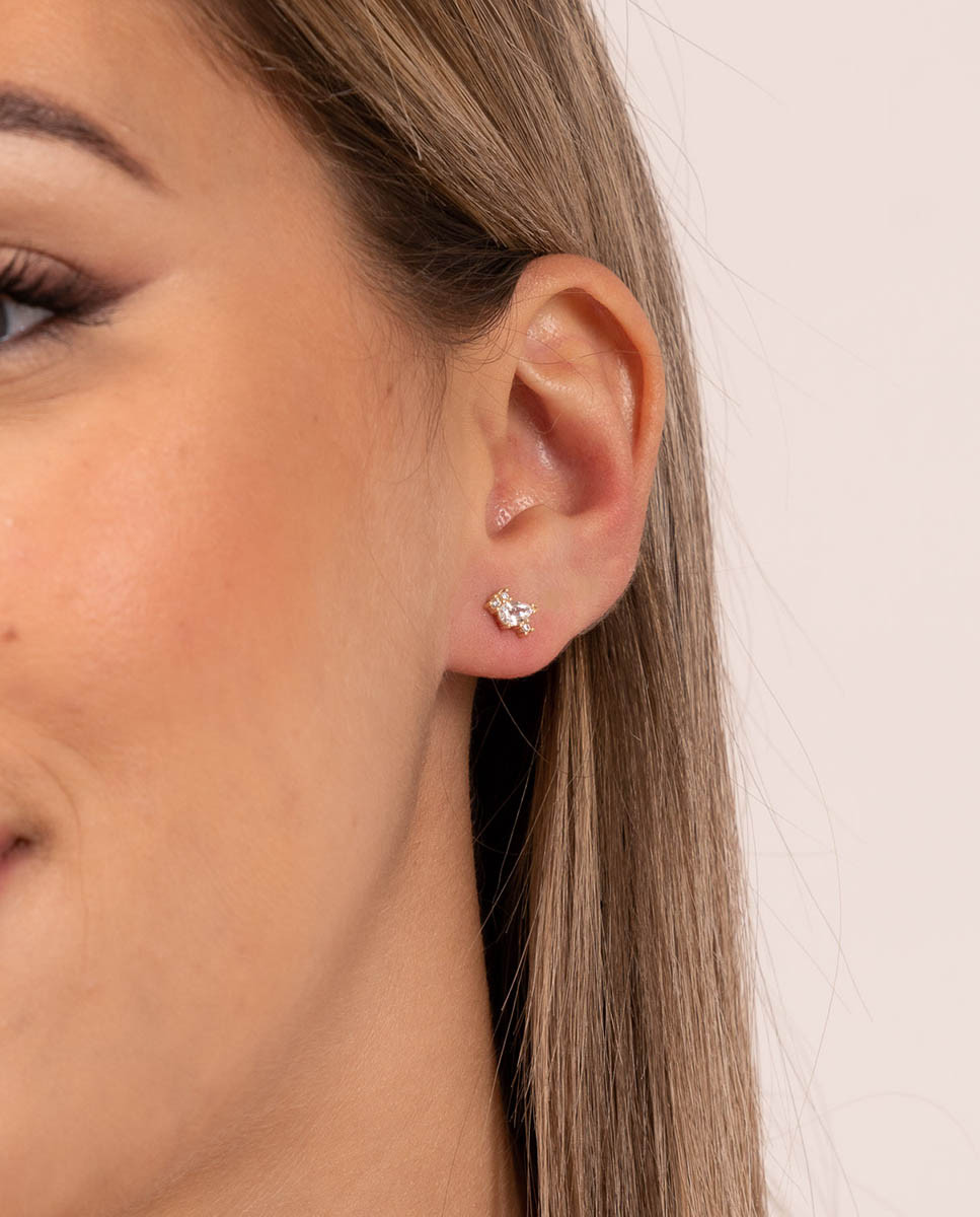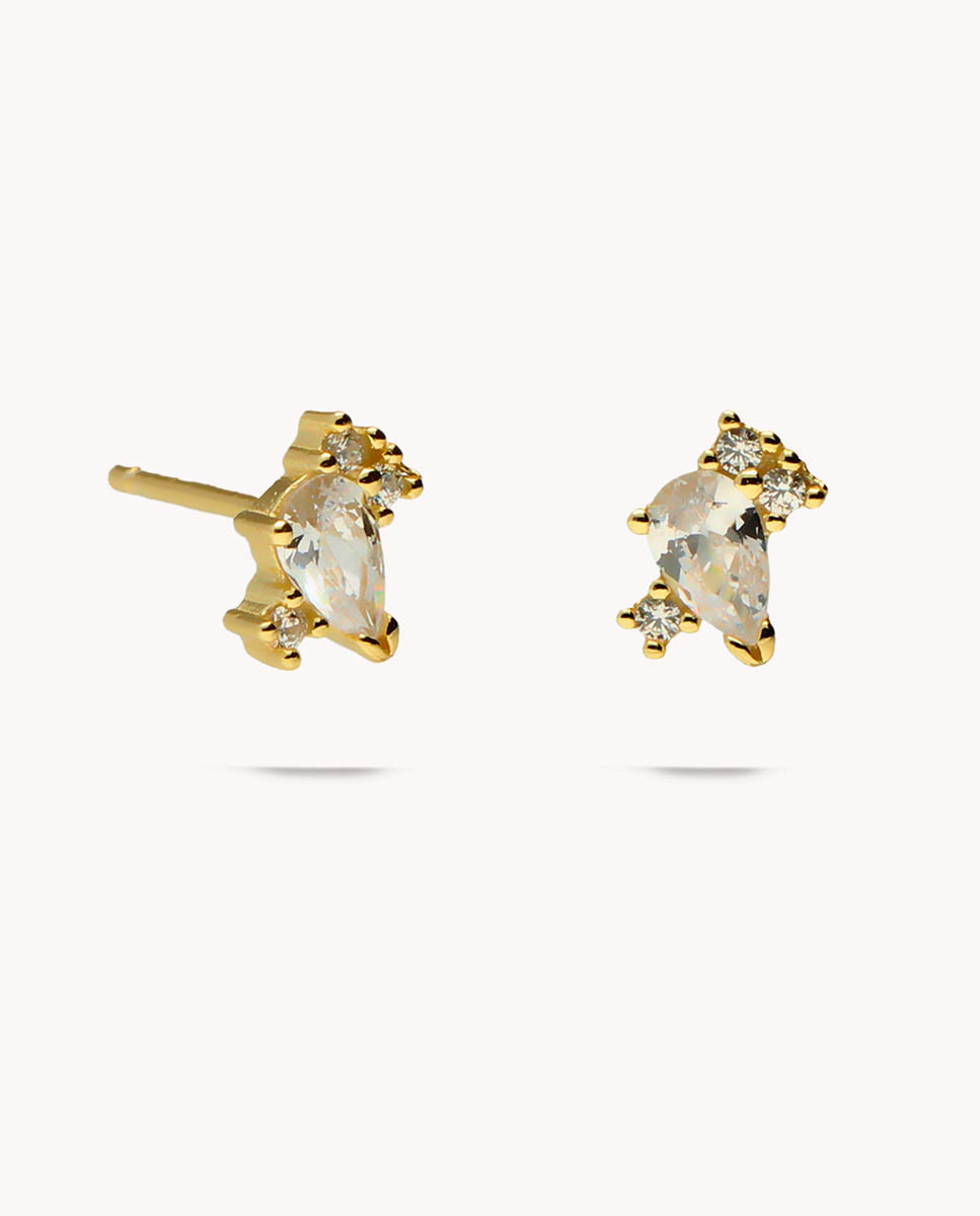 Pendientes de plata de ley 925 bañada en oro 18K con cuatro circonitas blancas y cierre de presión.