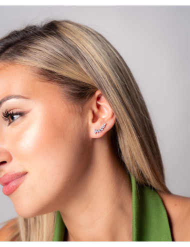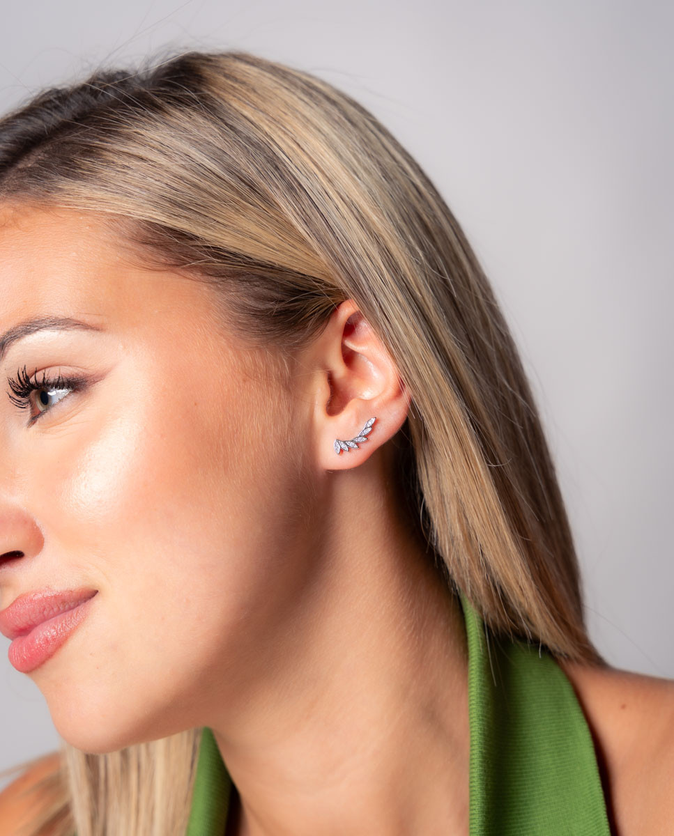 Pendientes trepadores de plata de ley 925 bañada en rodio con circonitas blancas en forma de rama, cierre de gancho y 1,5 cms de largo.