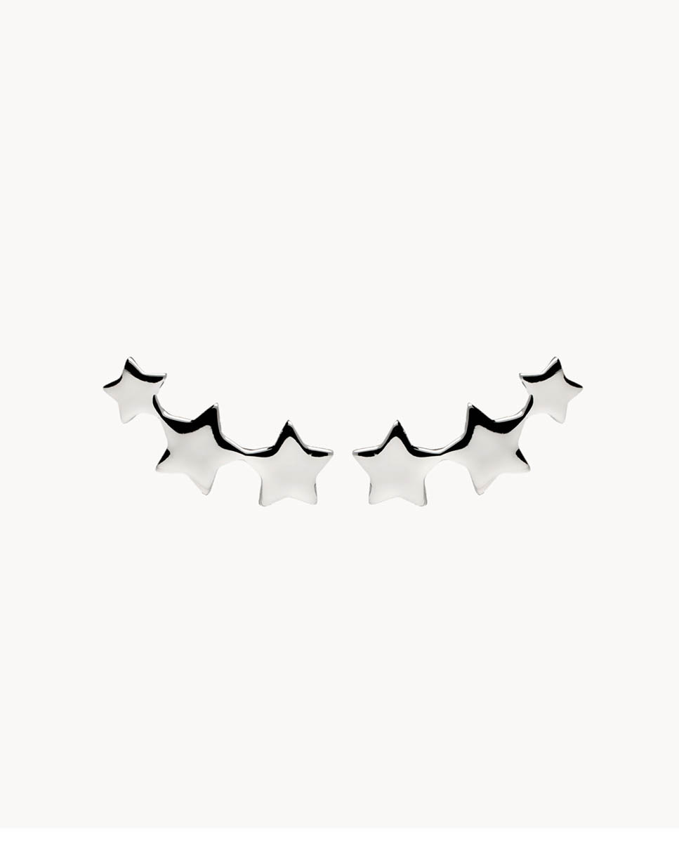 Pendientes trepadores de plata de ley 925 bañados en rodio con tres estrellas en disminución, largo de 1,5 cms y cierre de presión.