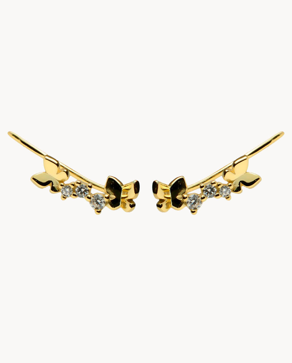 Pendientes trepadores de plata de ley 925 bañados en oro con mariposas y circonitas blancas, cierre de gancho y 1,3 cms de largo.