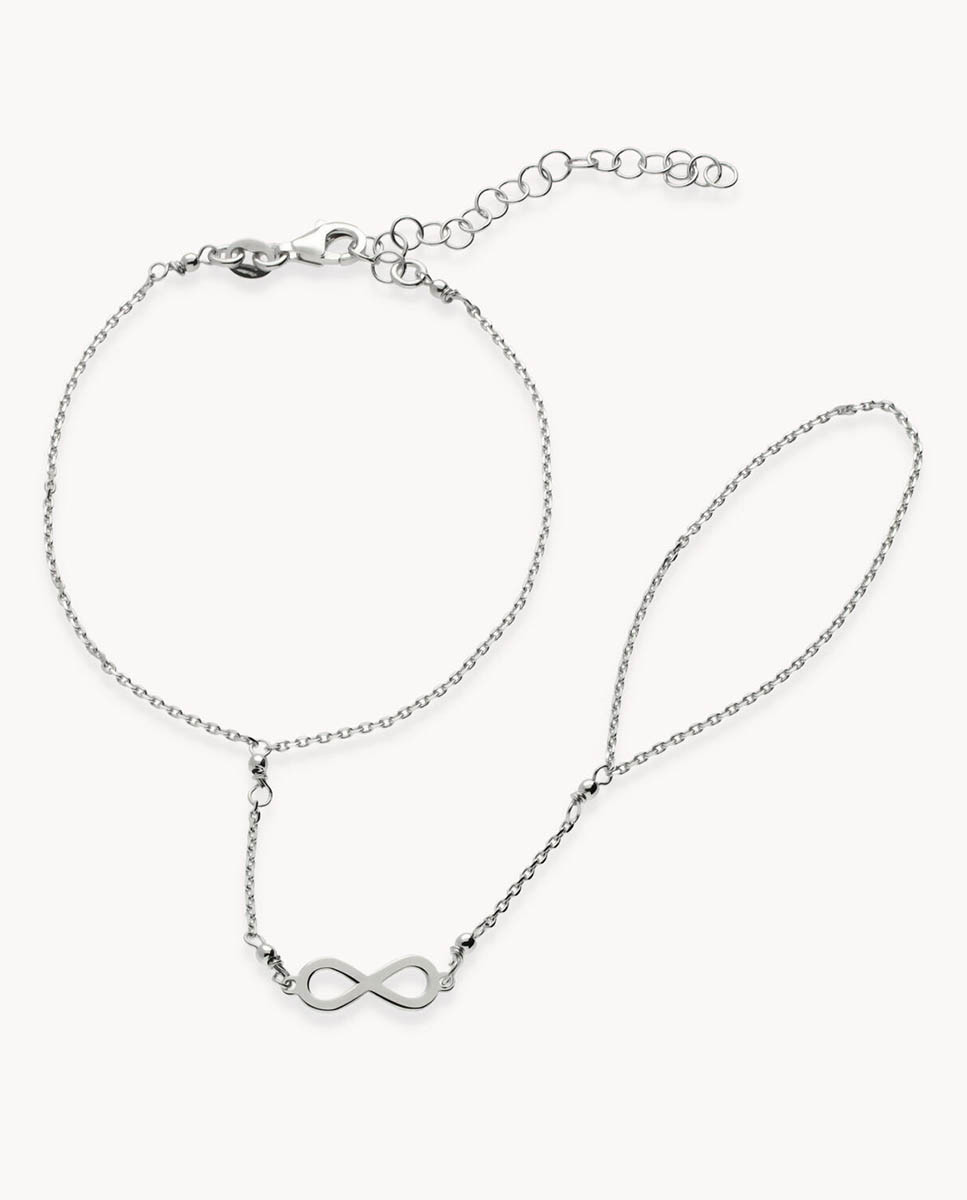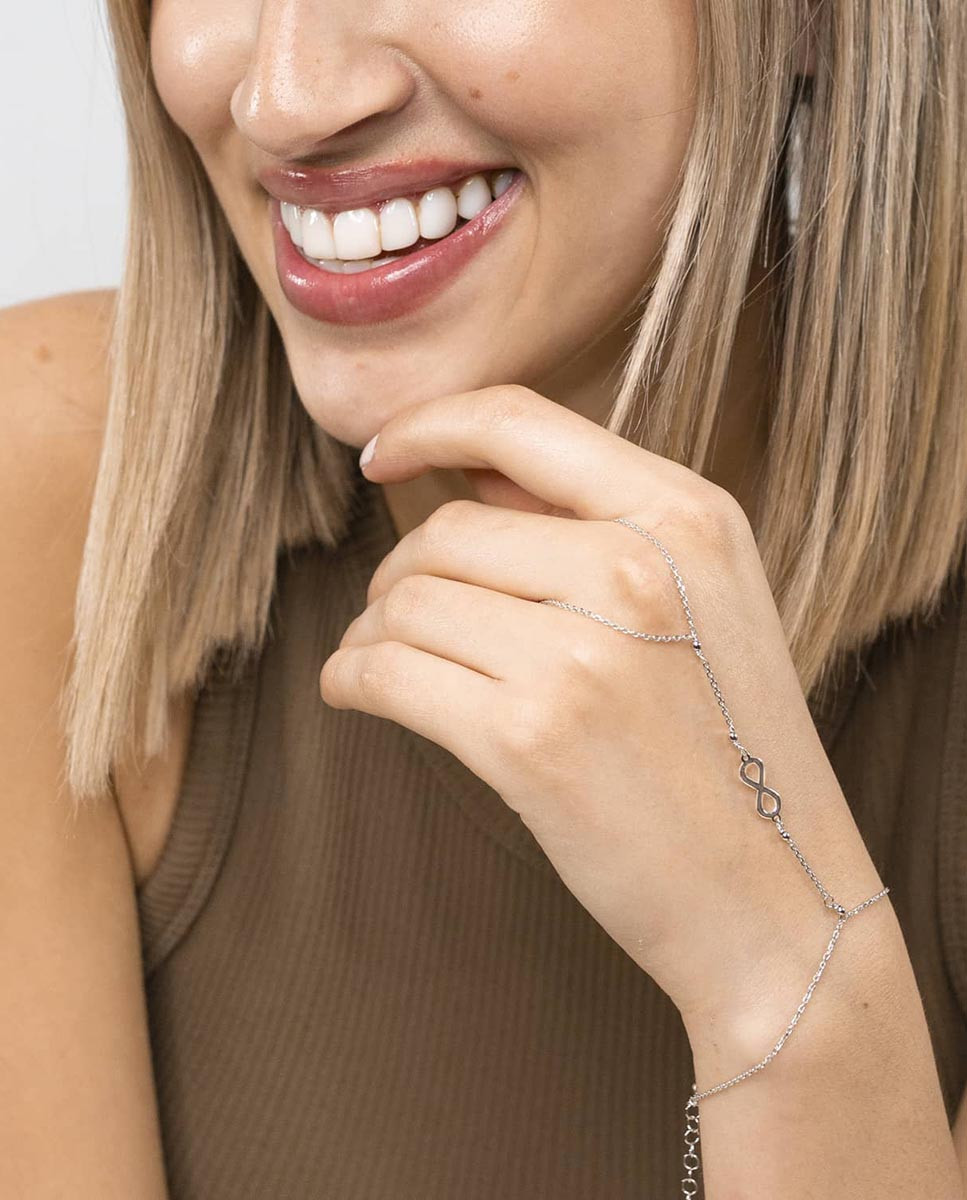 Pulsera de dedo de plata de ley 925 bañada en rodio con motivo central de infinito, largo de 16 cms más 6 cms de alargador y cierre de mosquetón.