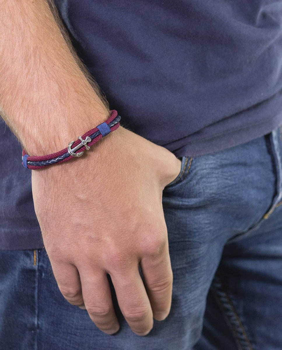 Pulsera de acero inoxidable con nylon rojo en los laterales y cuero azul en el centro, motivo central de ancla, cierre regulable y 21 cms de largo.
