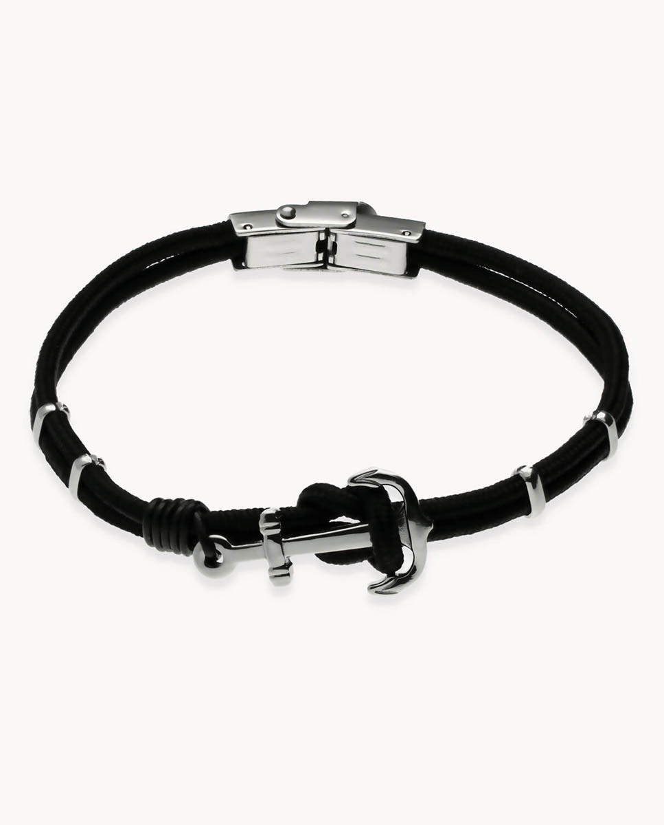 Pulsera de acero inoxidable y nylon doble negro con apliques de acero en los extremos y motivo central de ancla en acero de 28 mm x 14 mm (ancho por alto), largo de 22 cms y cierre regulable.