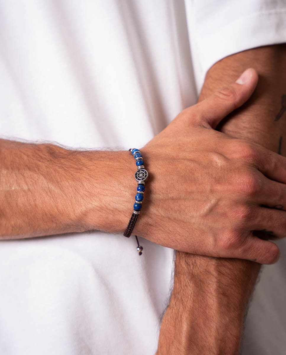 Pulsera de acero inoxidable con macramé marrón y piedras de Lapislázuli de 6 mm de diámetro combinadas con entrepiezas de acero inoxidable y pieza central de 10 mm de diámetro con ancla y timón, cierre ajustable de 5,5 cms a 10 cms de diámetro.