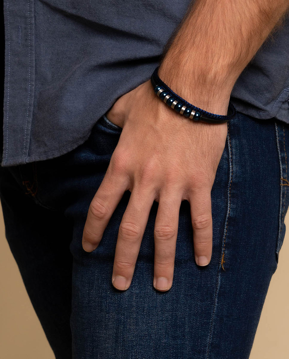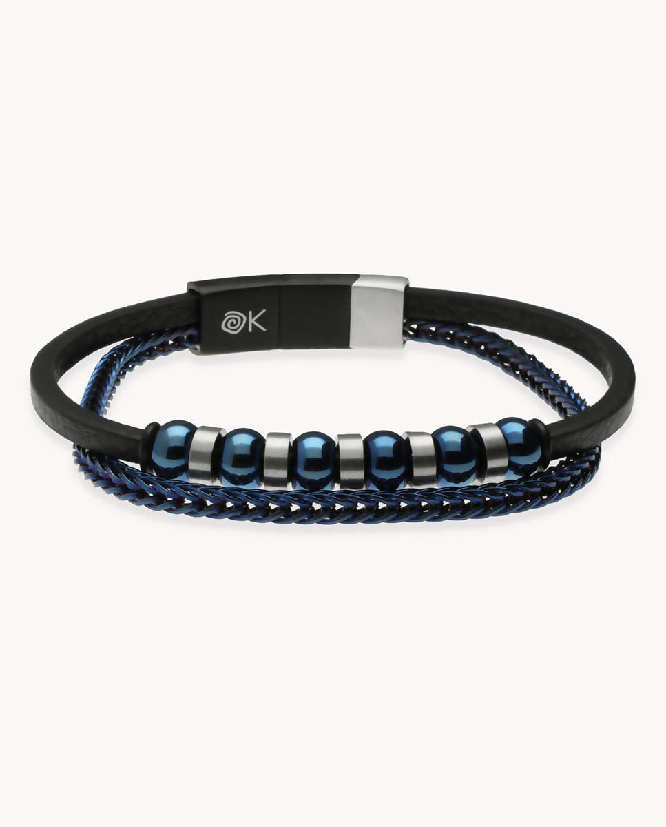 Pulsera de acero inoxidable doble: cuero negro de 4 mm de ancho y 3 mm de grosor con detalle central de bolas en IP azul combinadas con entrepiezas de acero y cadena barbada de 3 mm de ancho en IP azul, largo de 20 cms a 21 cms y cierre de imán con una pieza extraíble.