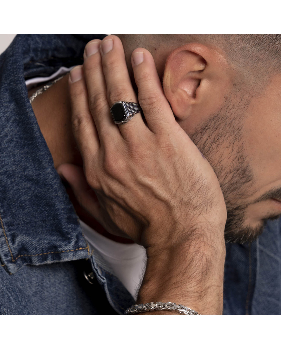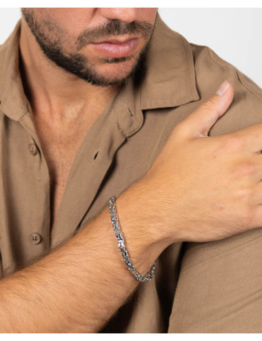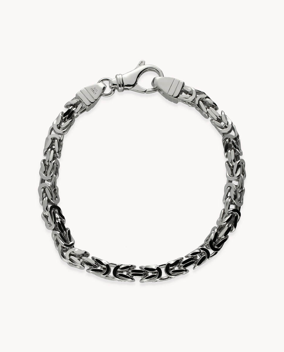 Pulsera de plata de ley 925 bañada en rodio con eslabon tipo bizantino de 5 mm de ancho, cierre de mosquetón y 22 cms de largo.