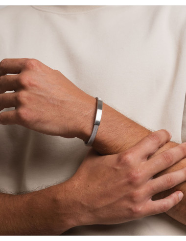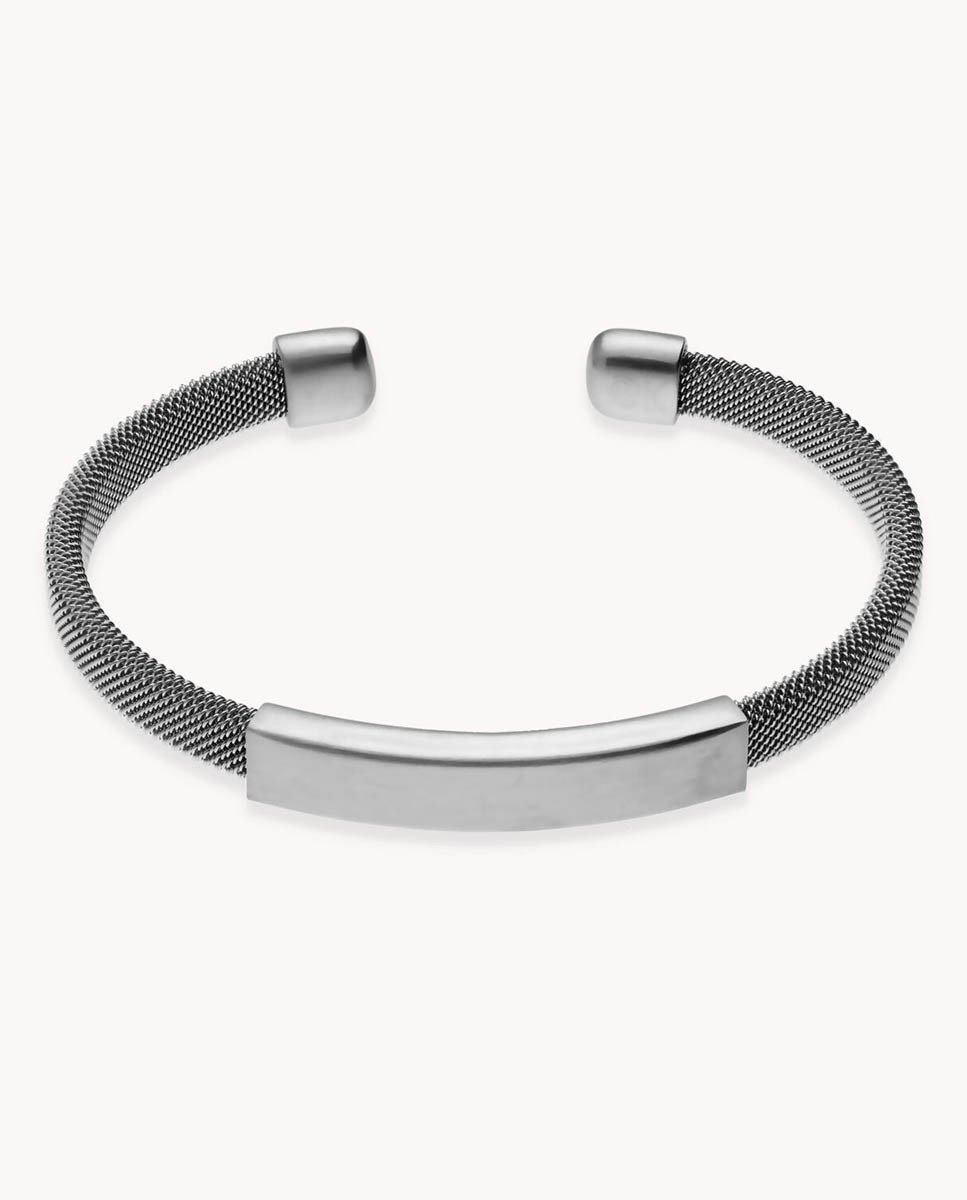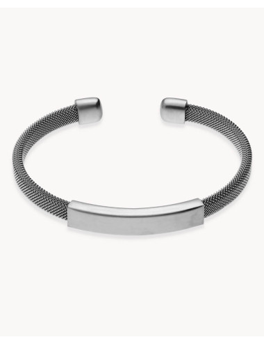 Pulsera abierta tipo brazalete de acero inoxidable de 64 mm de diámetro interior con placa central de 38 mm x 7 mm (largo por ancho) y 4 mm de grosor.