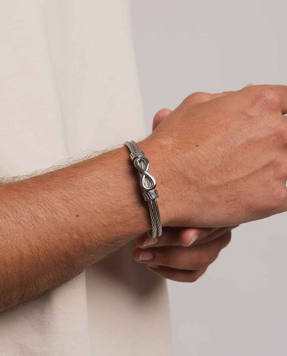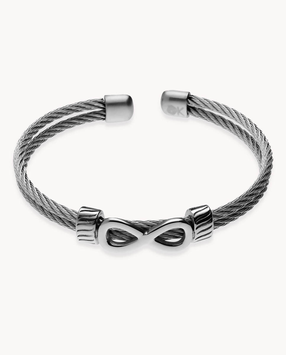 Pulsera abierta tipo brazalete de acero inoxidable de 63 mm de diámetro interior con motivo central de infinito de 24 mm x 10 mm (largo por ancho).