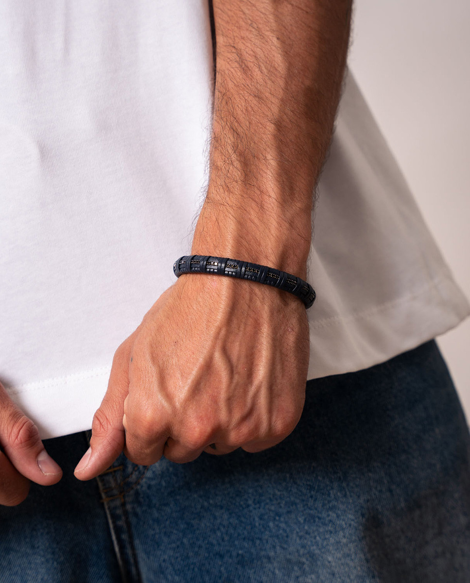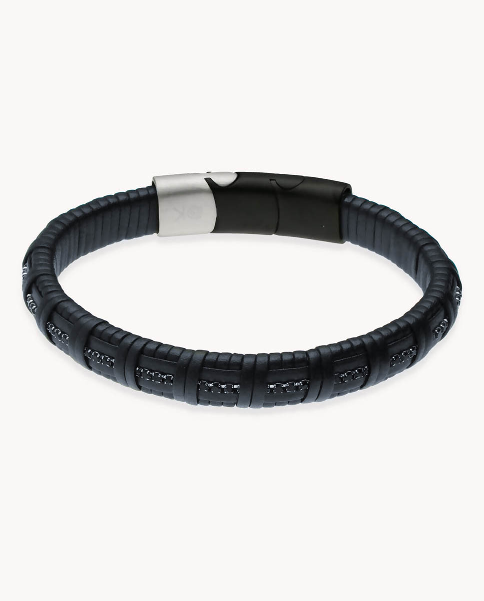 Pulsera de acero inoxidable con cuero azul trenzado de 8 mm de ancho y 5 mm de grosor con tira de circonitas negras incrustadas, cierre de imán con pieza extraíble y 21 cms de largo.