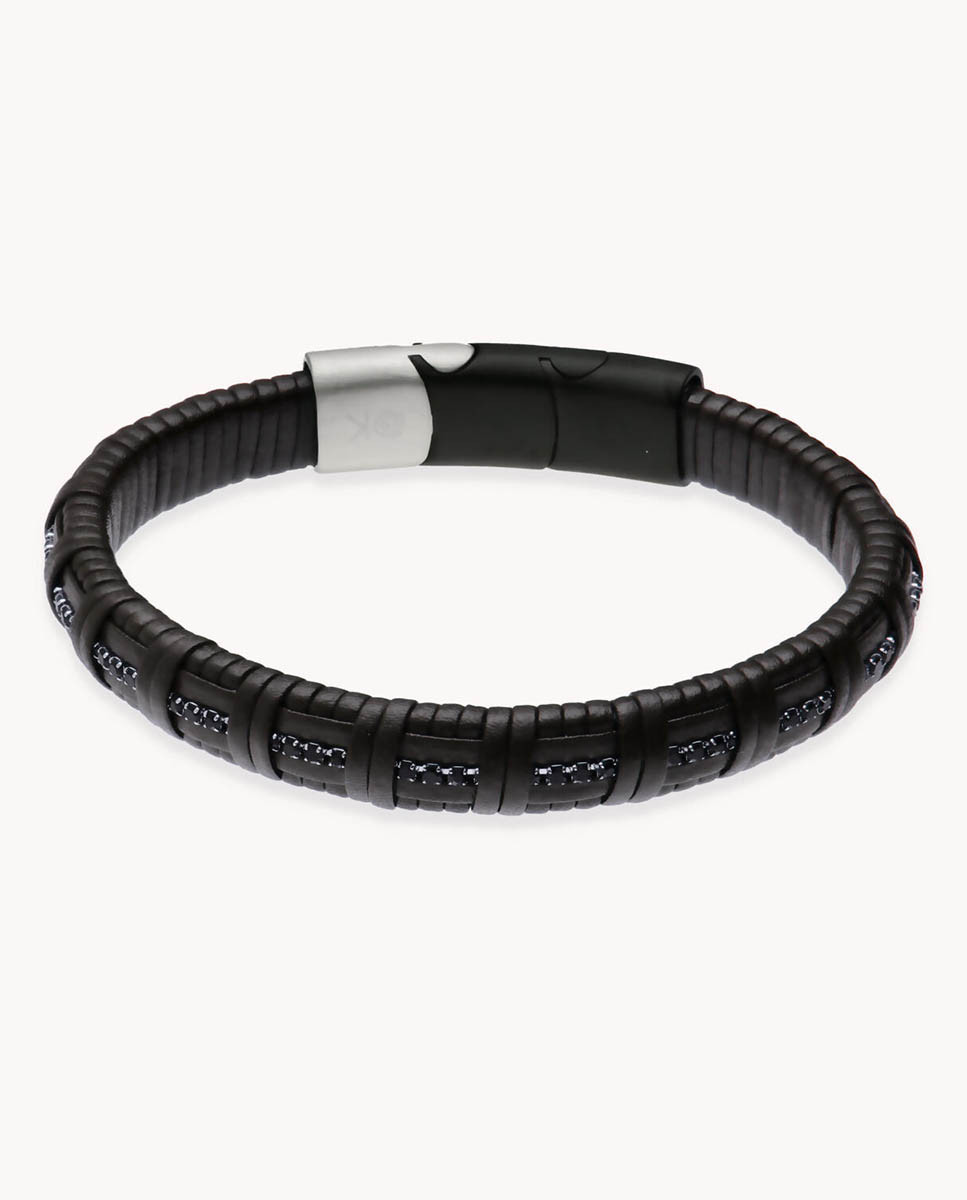 Pulsera de acero inoxidable con cuero marrón trenzado de 8 mm de ancho y 5 mm de grosor con tira de circonitas negras incrustadas, cierre de imán con pieza extraíble y 21 cms de largo.