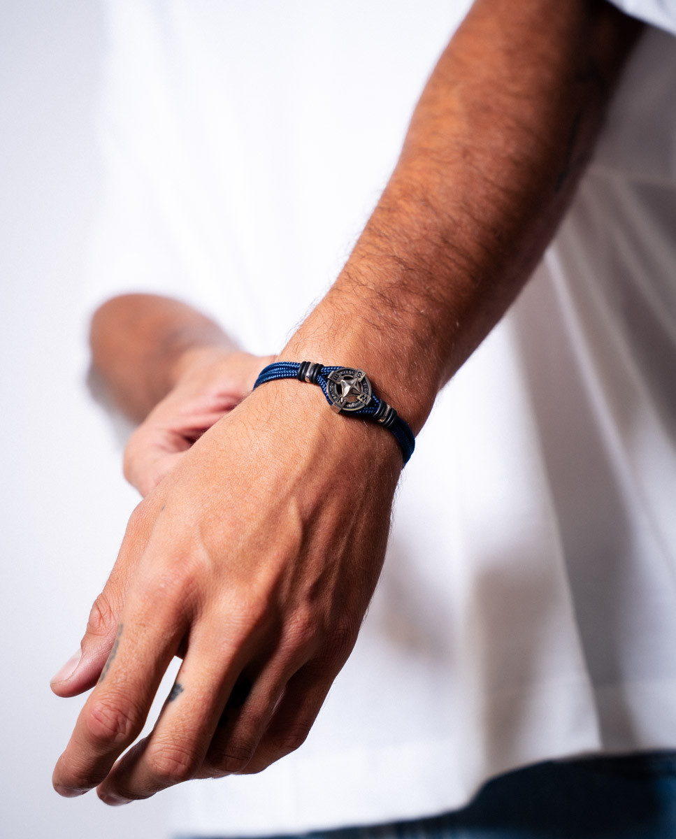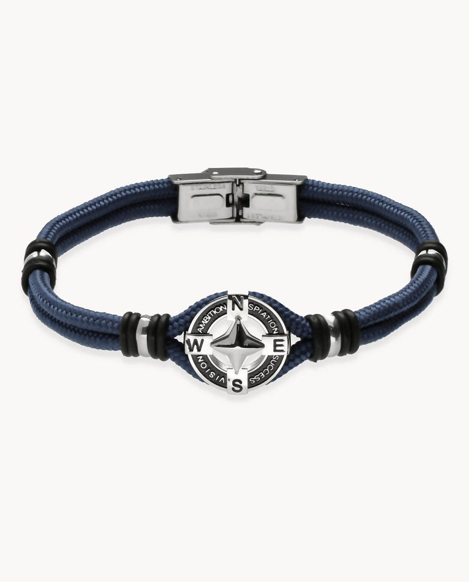 Pulsera de acero inoxidable y nylon doble azul con apliques en los extremos, motivo central en forma de brújula con detalles esmaltados en negro, 20,5 cms de largo y cierre regulable.