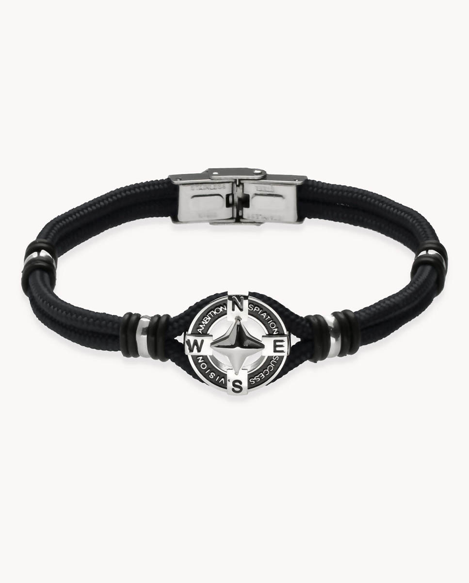 Pulsera de acero inoxidable y nylon doble negro con apliques en los extremos, motivo central en forma de brújula con detalles esmaltados en negro, 20,5 cms de largo y cierre regulable.