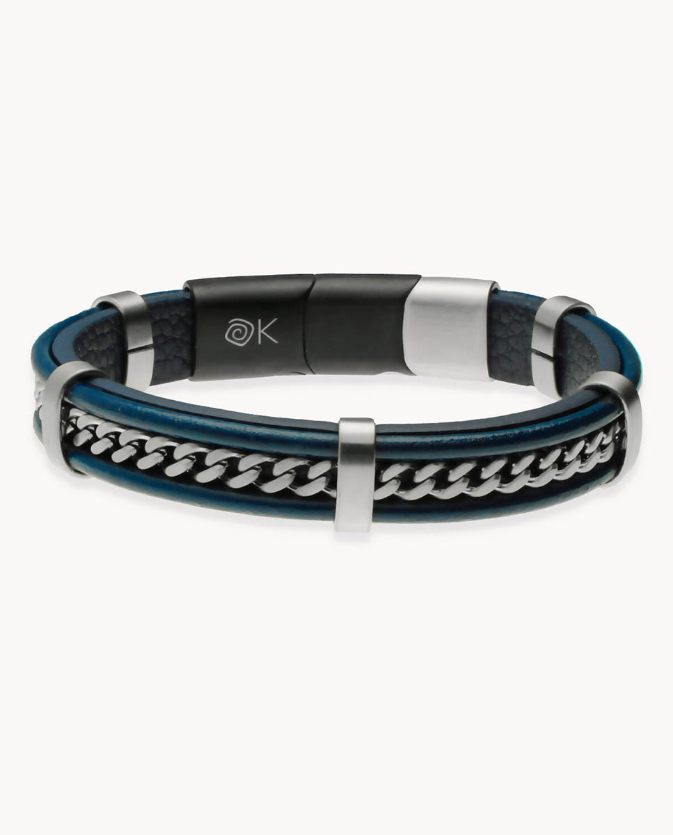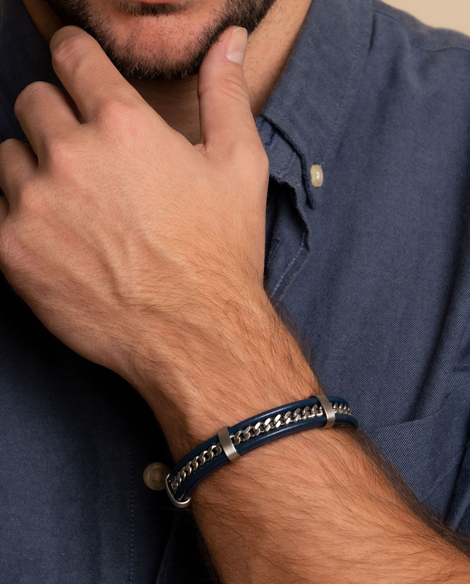 Pulsera cadena en cuero azul y acero inoxidable