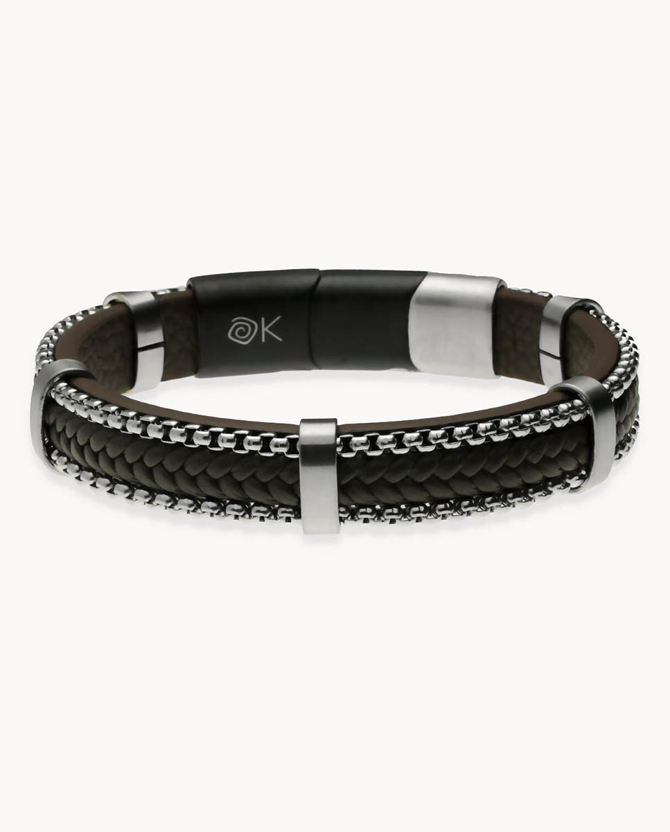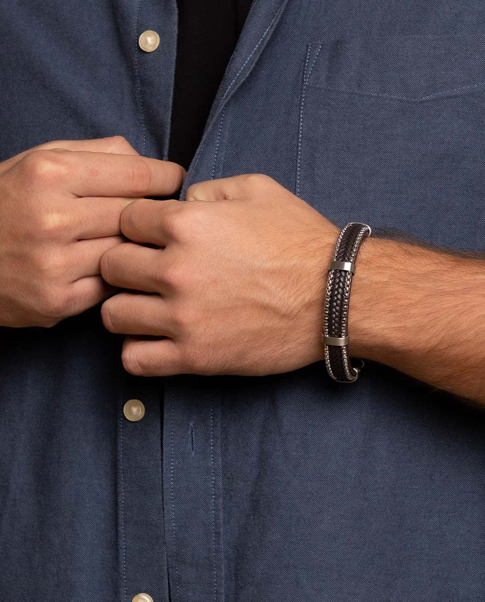Pulsera de acero inoxidable con cuero marrón de 11 mm de ancho y 5 mm de grosor, detalle en los extremos de cadena en IP metálico mate y cuero trenzado marrón en la parte central, largo de 20 cms a 21 cms y cierre de imán con una pieza extraíble.